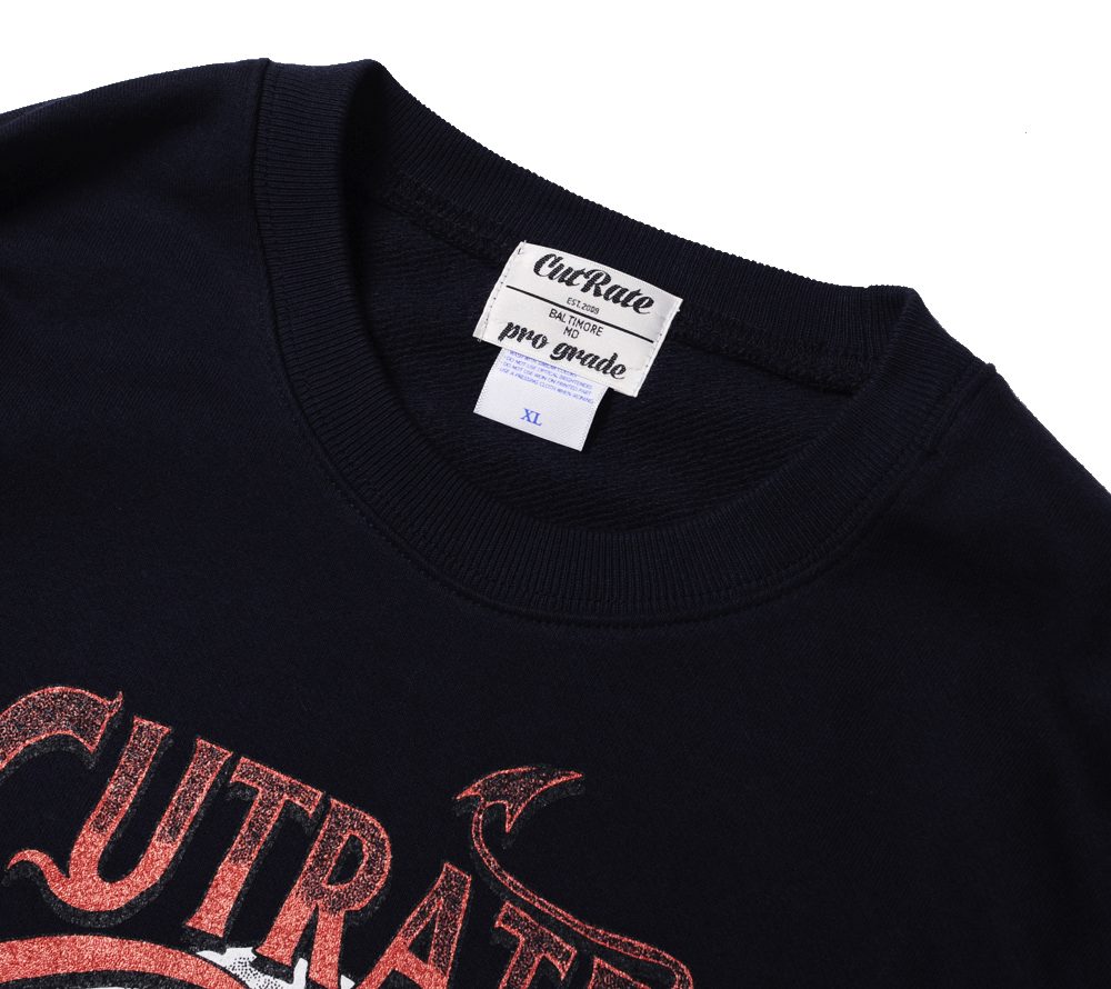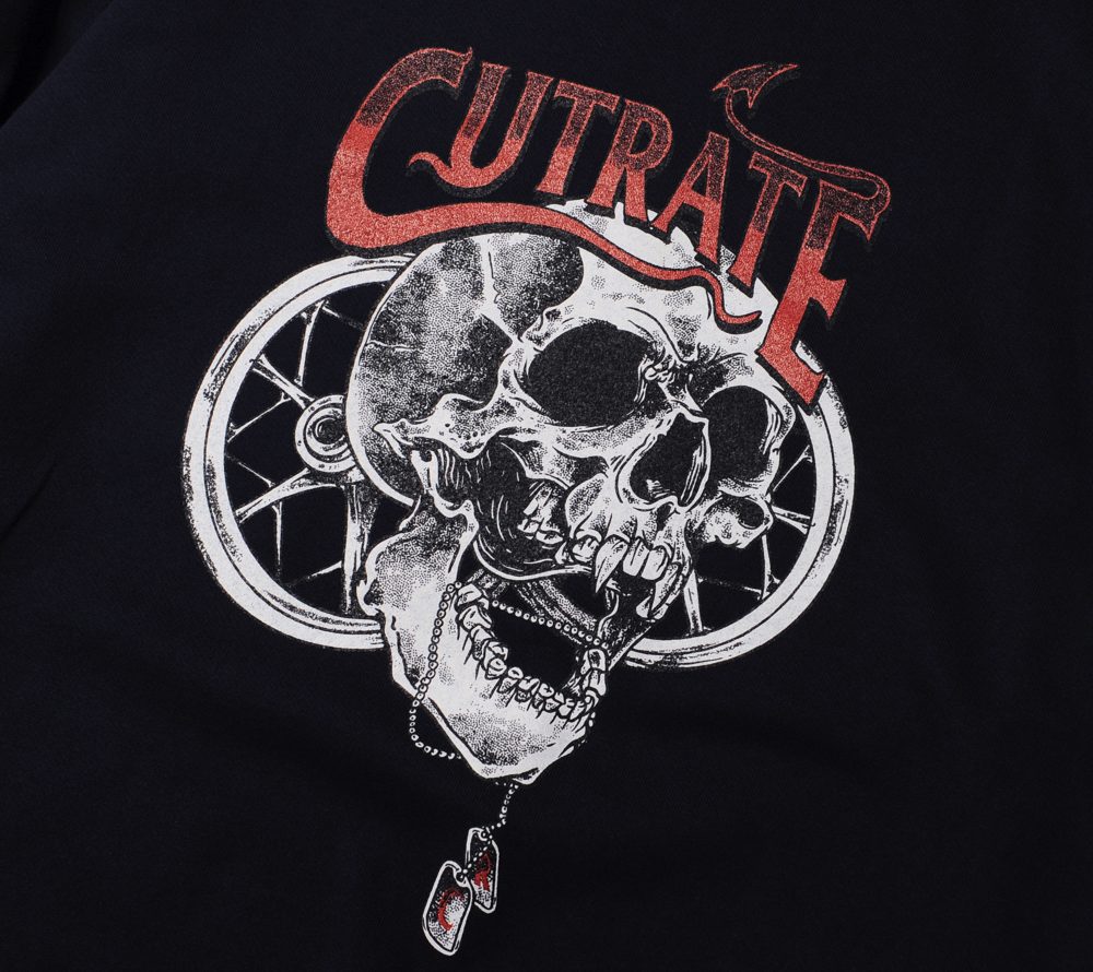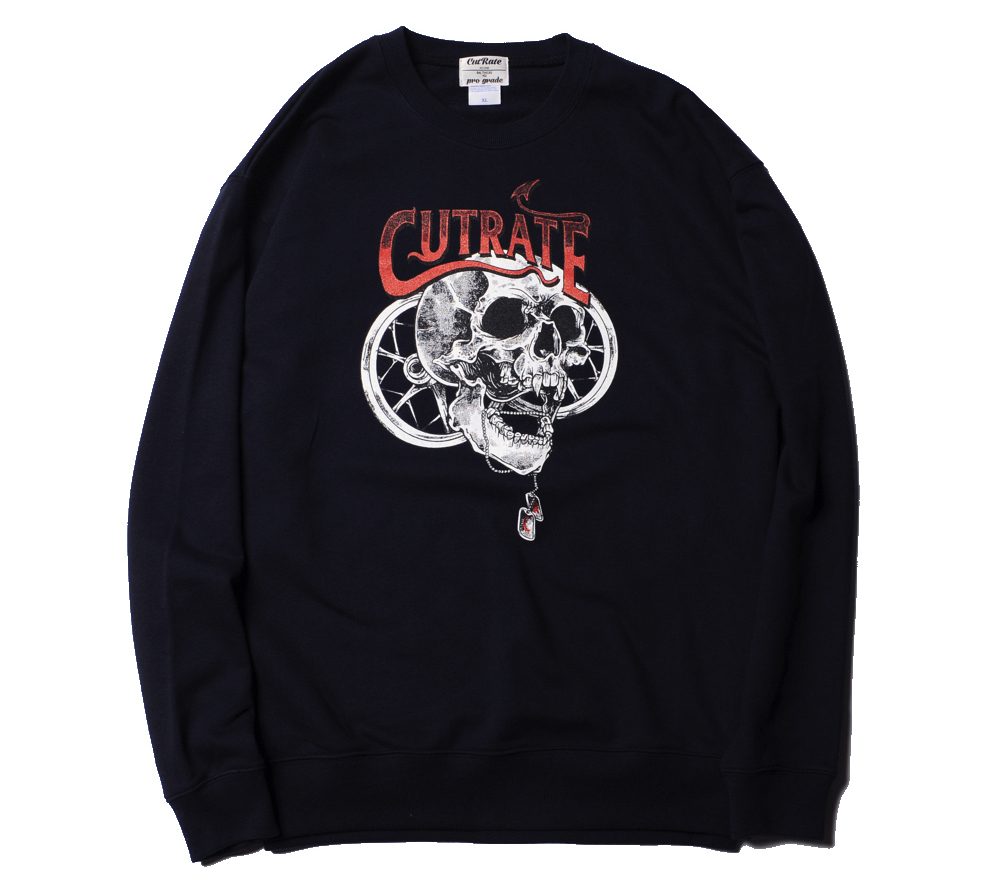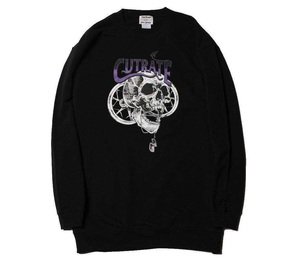 コットン100%ボディーを使用したスウェットシャツ。フロントにはスカルとウィールのプリントを配しています。音楽的な要素とモーターサイクルな要素を組み合わせた、CUTRATEらしいデザインに仕上がっています。