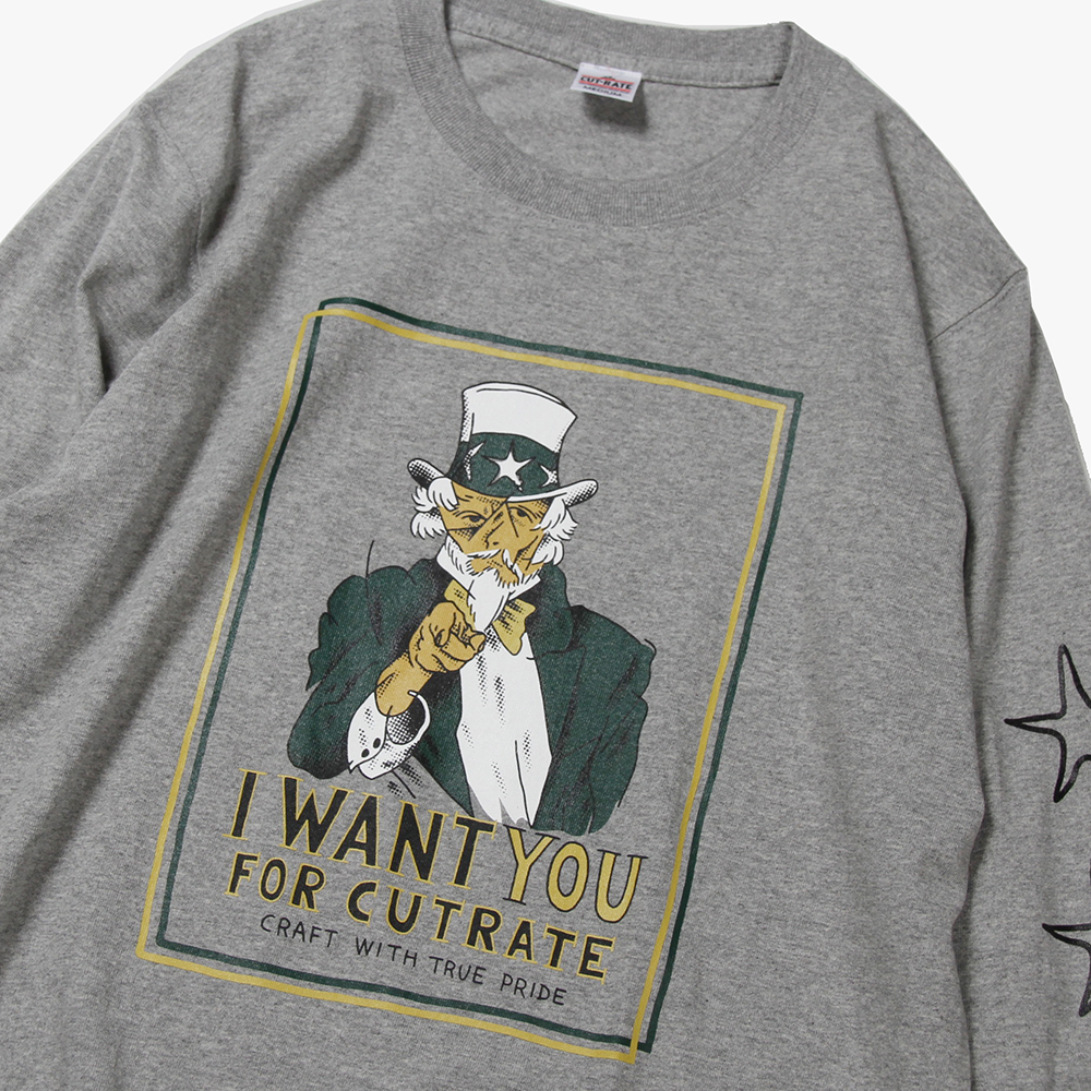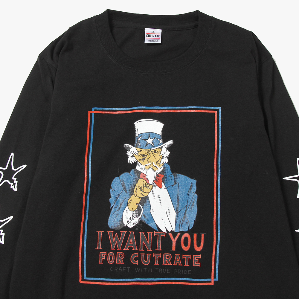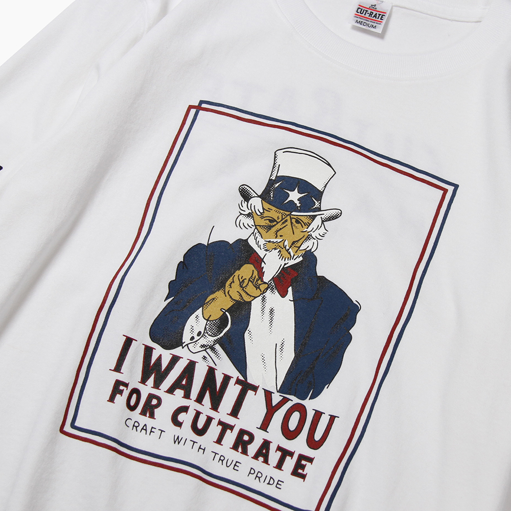 大阪のタトゥーアーティスト"HASKEY"の第3段。今回はアメリカのベトナム戦争時の兵役ポスターをハスキー流にて作製。フロントには"I WANT FOR CUTRATE"とメッセージがオン。袖の星もオリジナルのスターにてプリントされております。