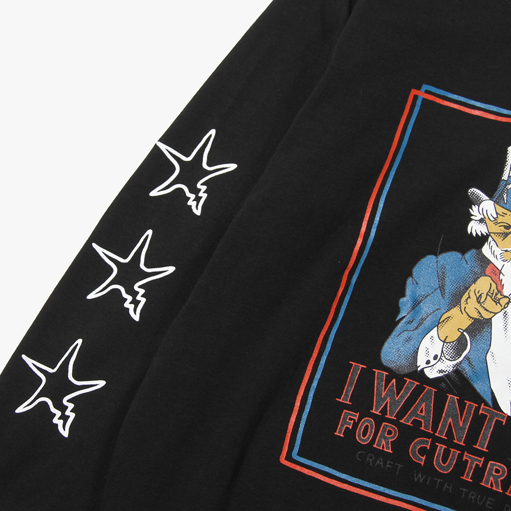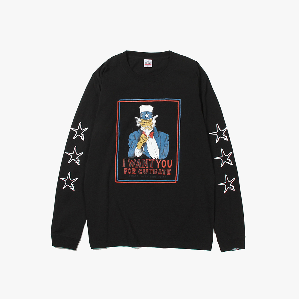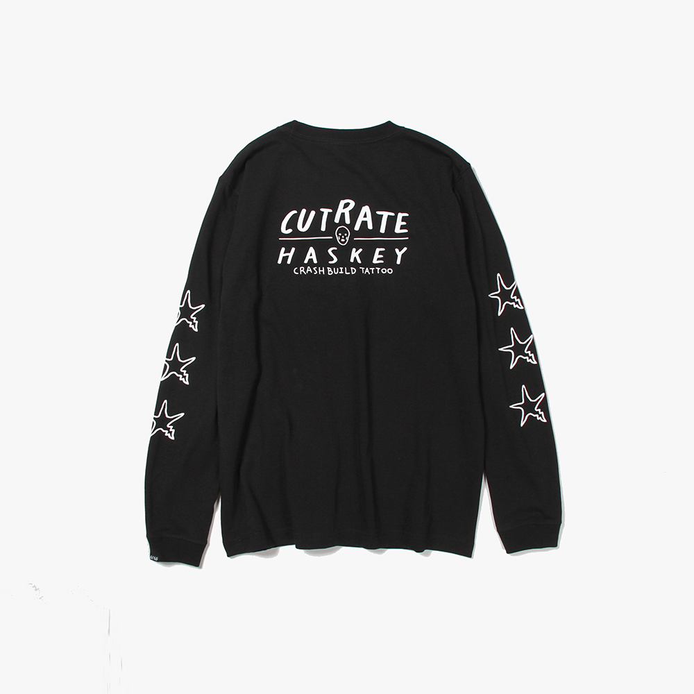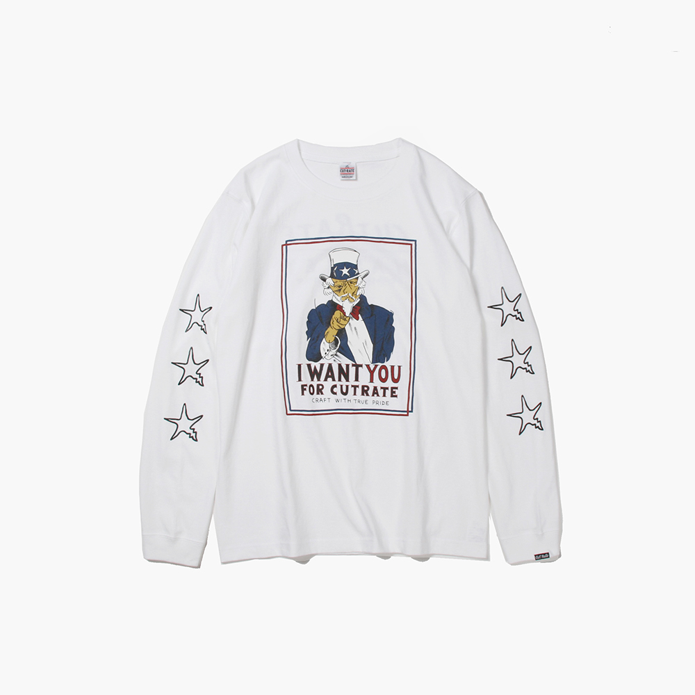 大阪のタトゥーアーティスト"HASKEY"の第3段。今回はアメリカのベトナム戦争時の兵役ポスターをハスキー流にて作製。フロントには"I WANT FOR CUTRATE"とメッセージがオン。袖の星もオリジナルのスターにてプリントされております。