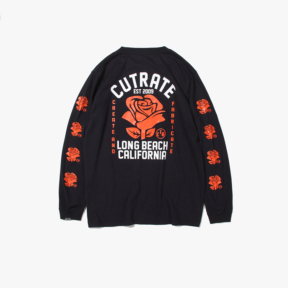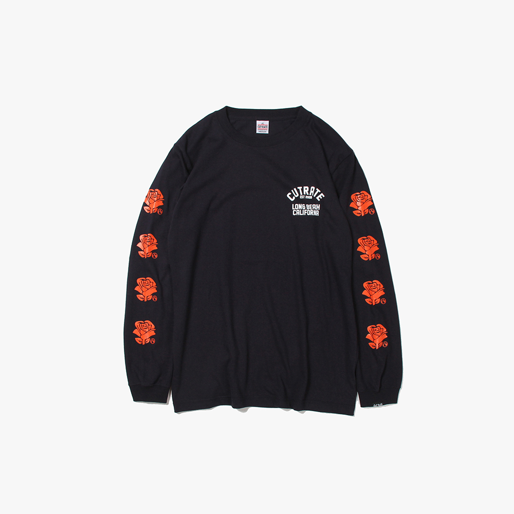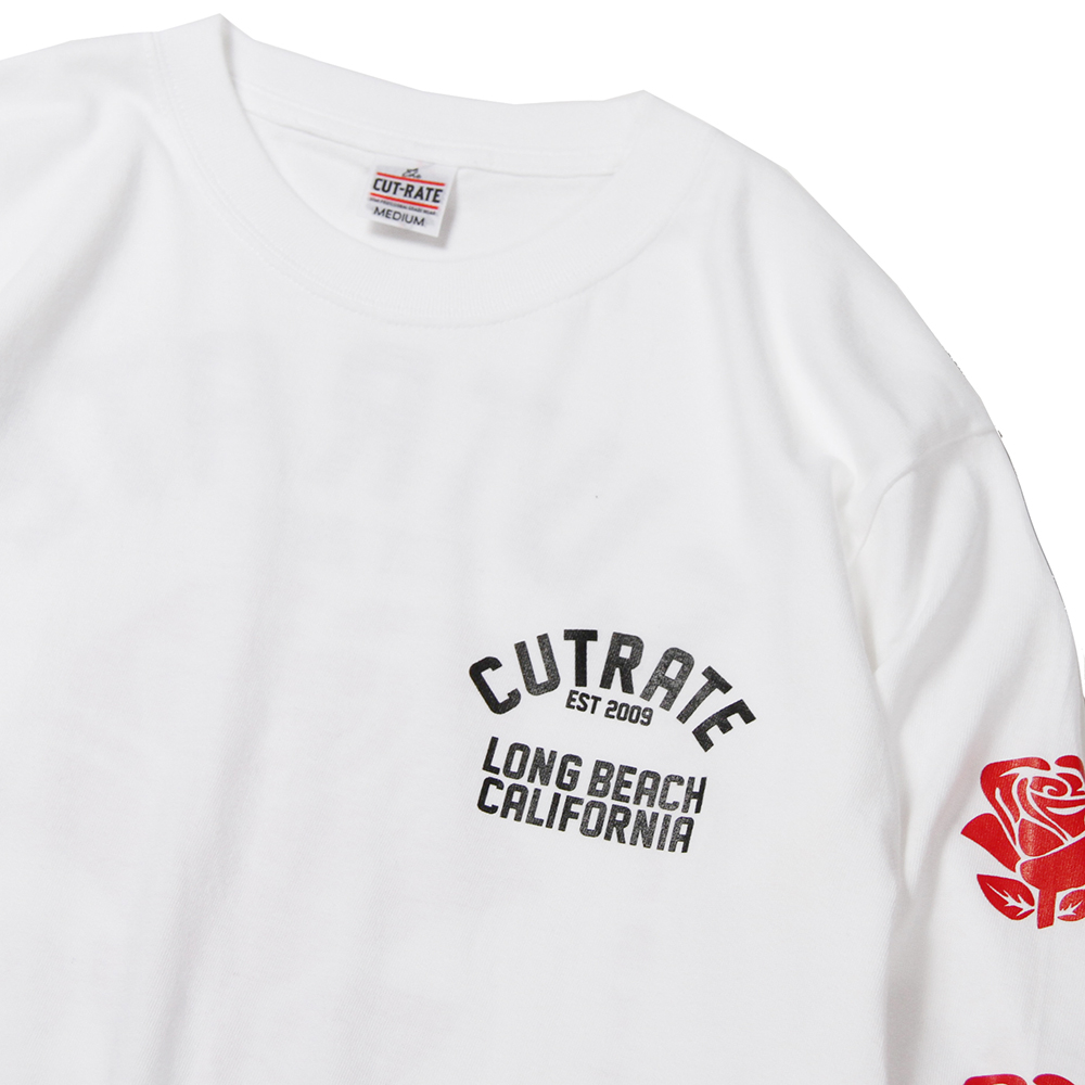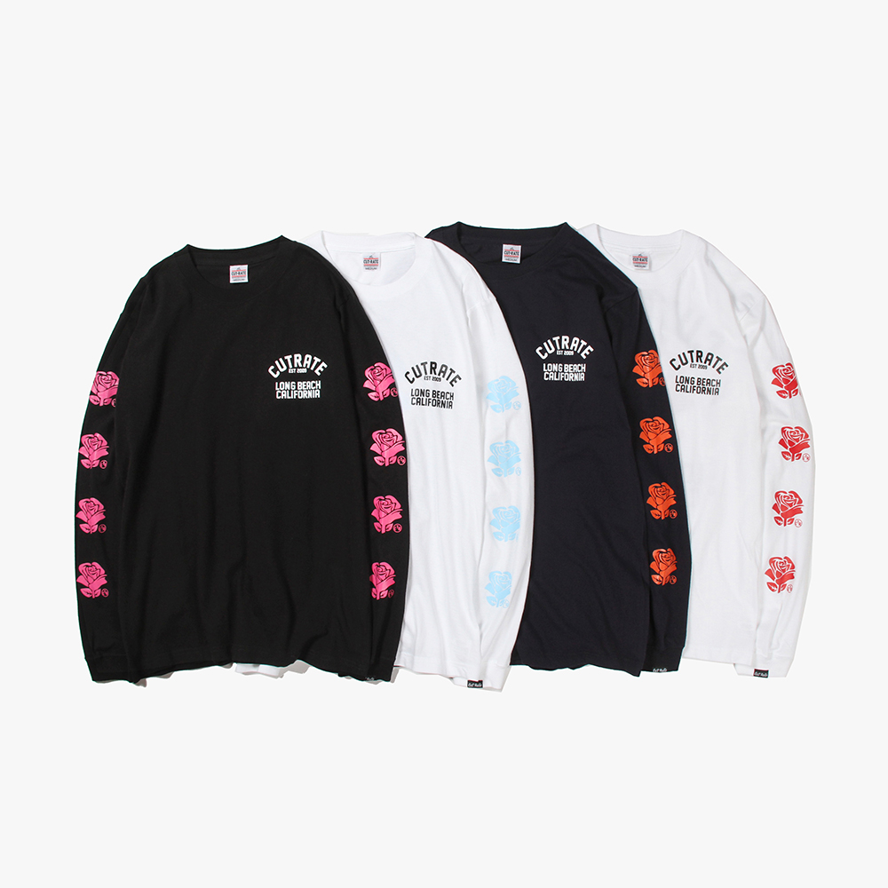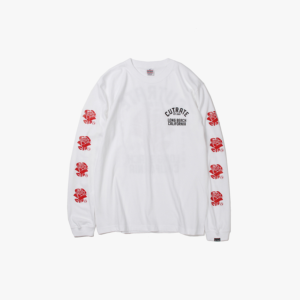 毎月第2日曜に行われるカリフォルニアで最もポピュラーなフリーマーケット"ROSE BOWL"を思い作製した薔薇のロゴ。背面に大判にてプリント。袖にも薔薇をプリントし、フロントにもロゴをオンした、コットン100%ボディのロンTになります。