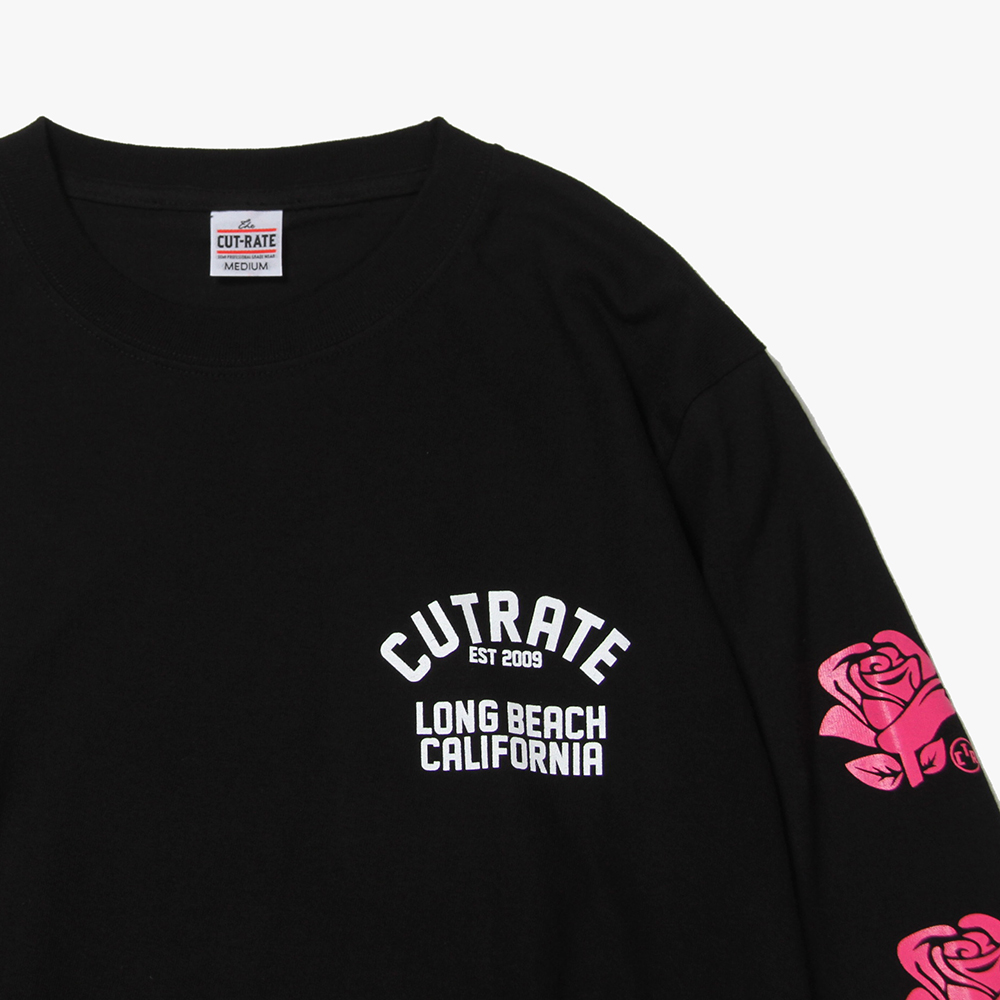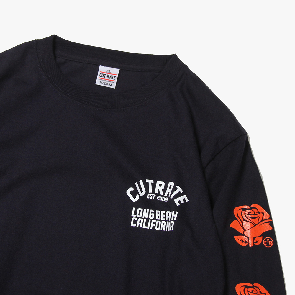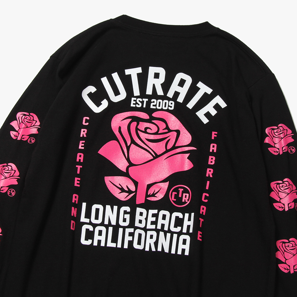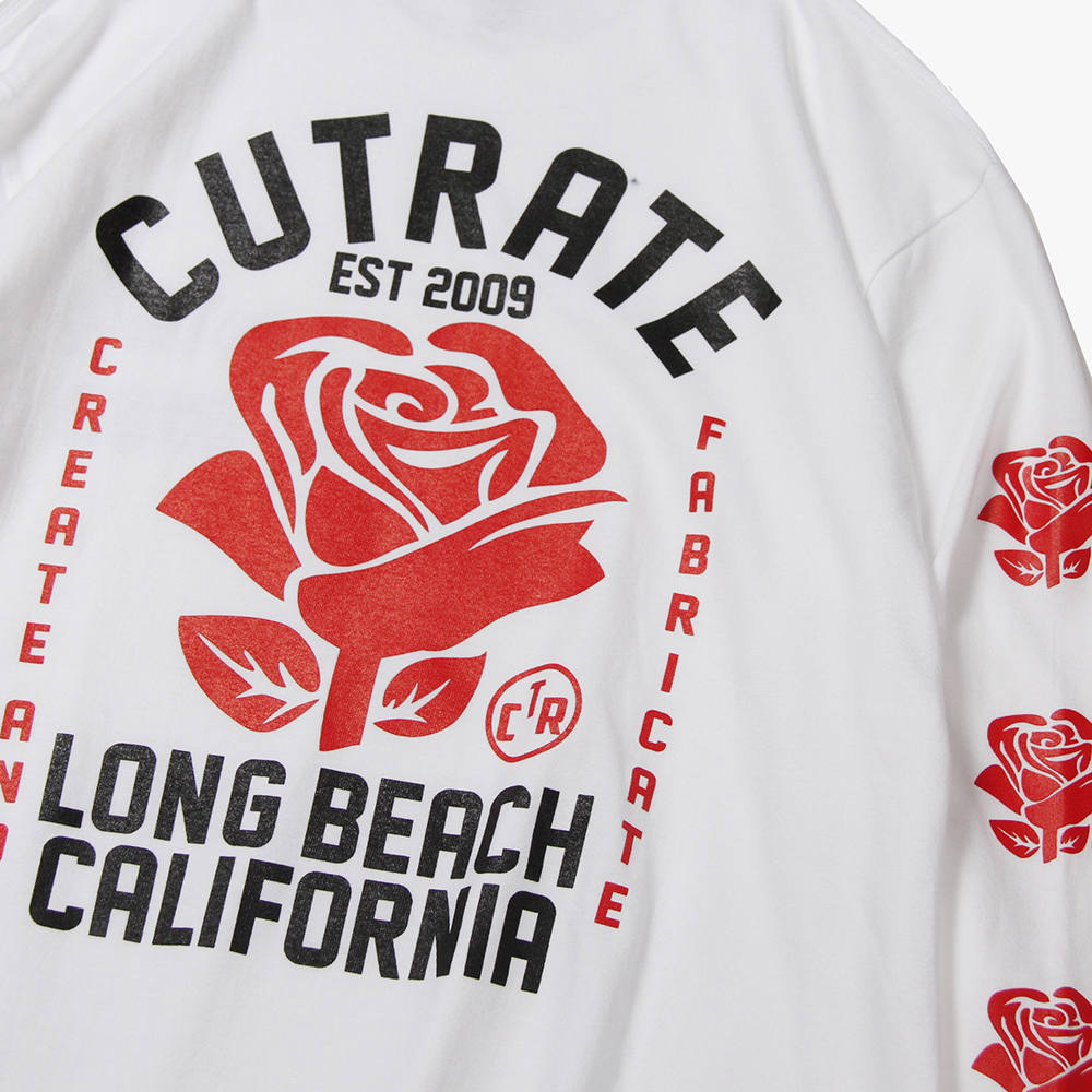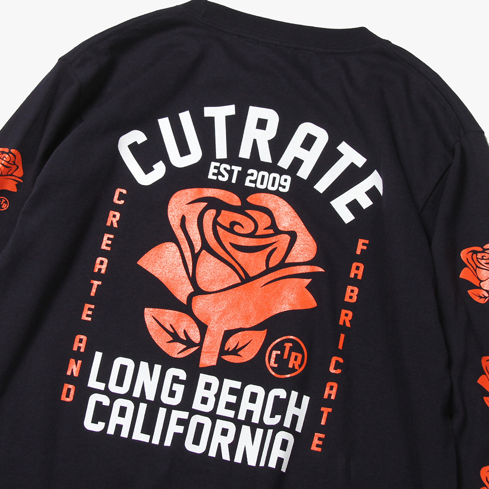 毎月第2日曜に行われるカリフォルニアで最もポピュラーなフリーマーケット"ROSE BOWL"を思い作製した薔薇のロゴ。背面に大判にてプリント。袖にも薔薇をプリントし、フロントにもロゴをオンした、コットン100%ボディのロンTになります。