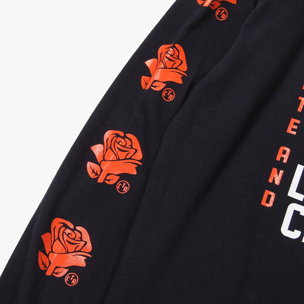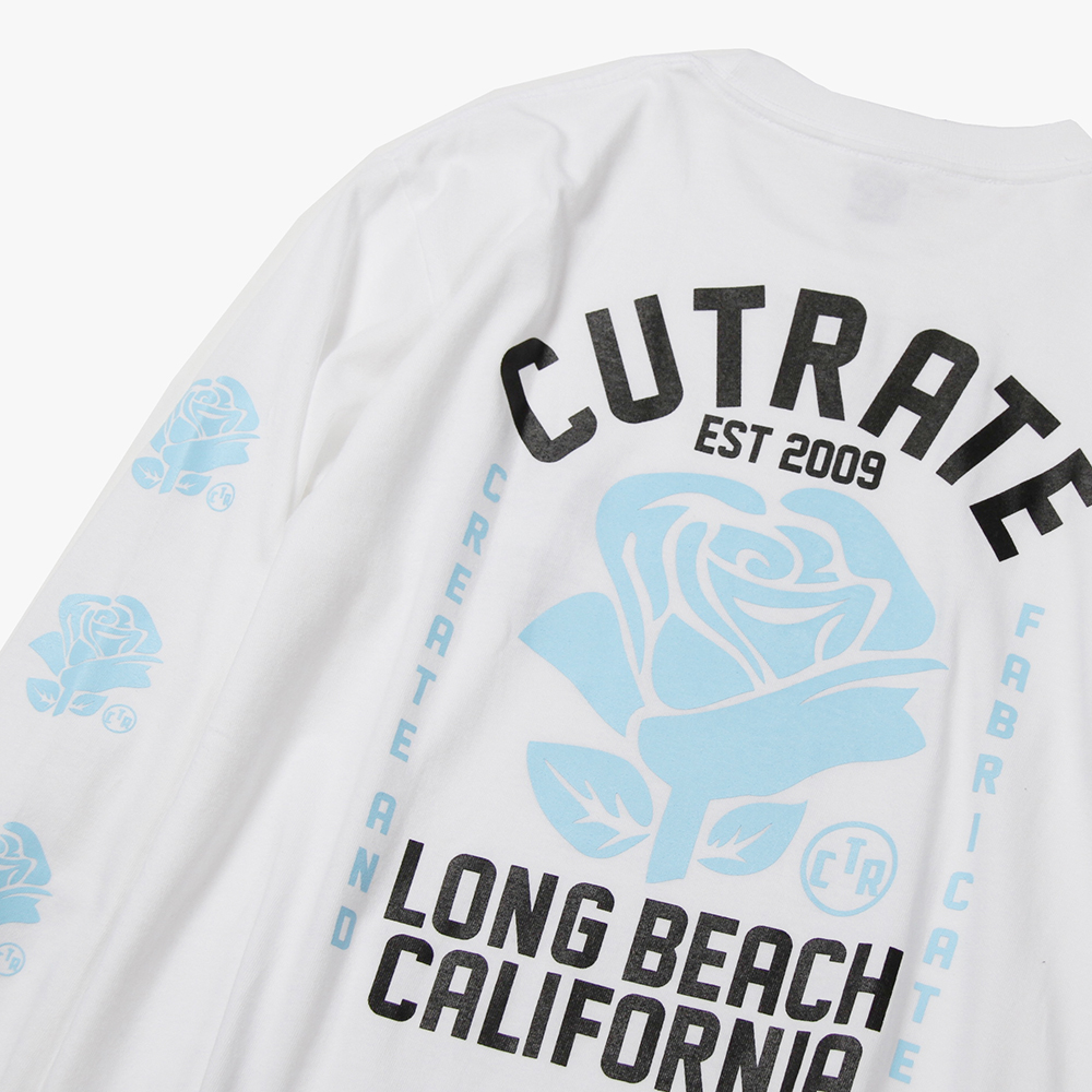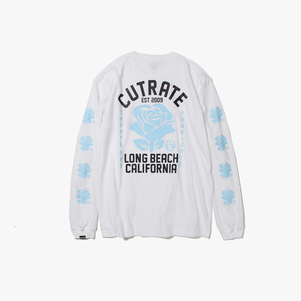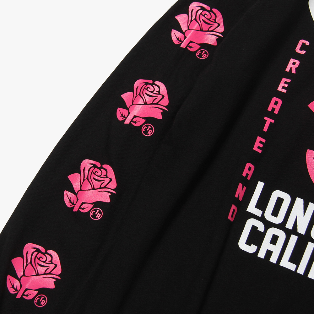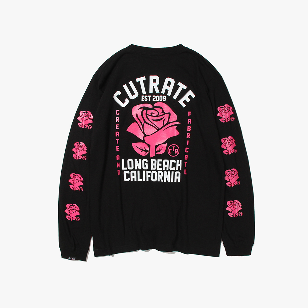 毎月第2日曜に行われるカリフォルニアで最もポピュラーなフリーマーケット"ROSE BOWL"を思い作製した薔薇のロゴ。背面に大判にてプリント。袖にも薔薇をプリントし、フロントにもロゴをオンした、コットン100%ボディのロンTになります。