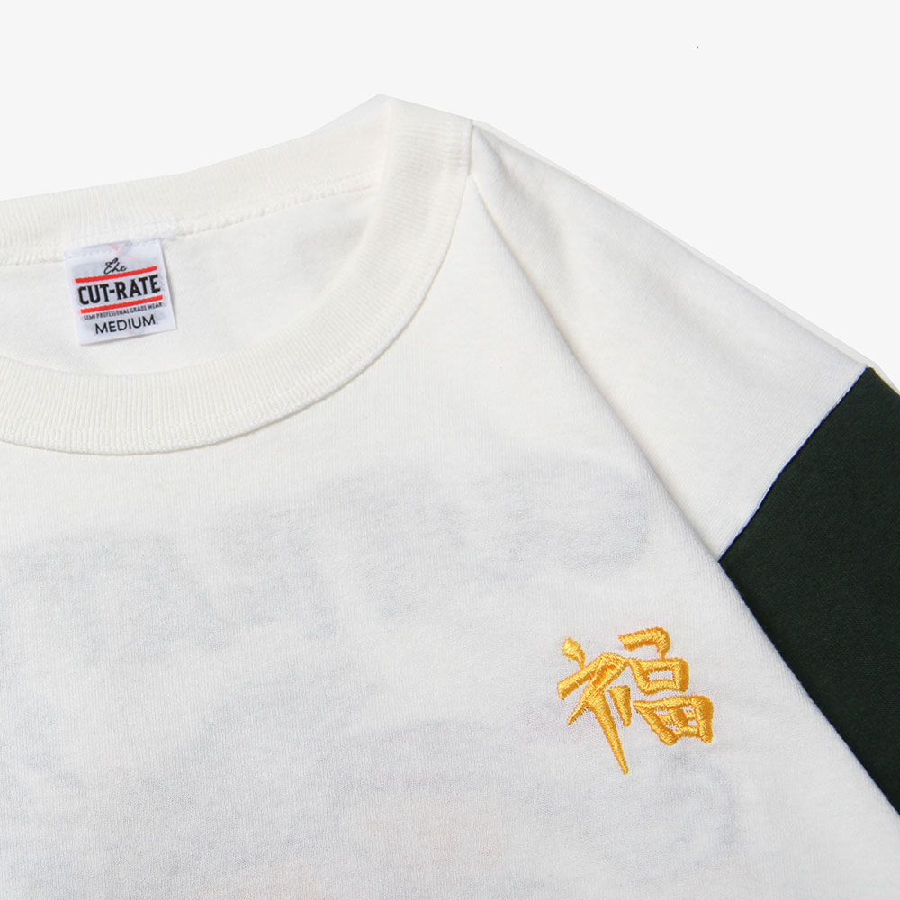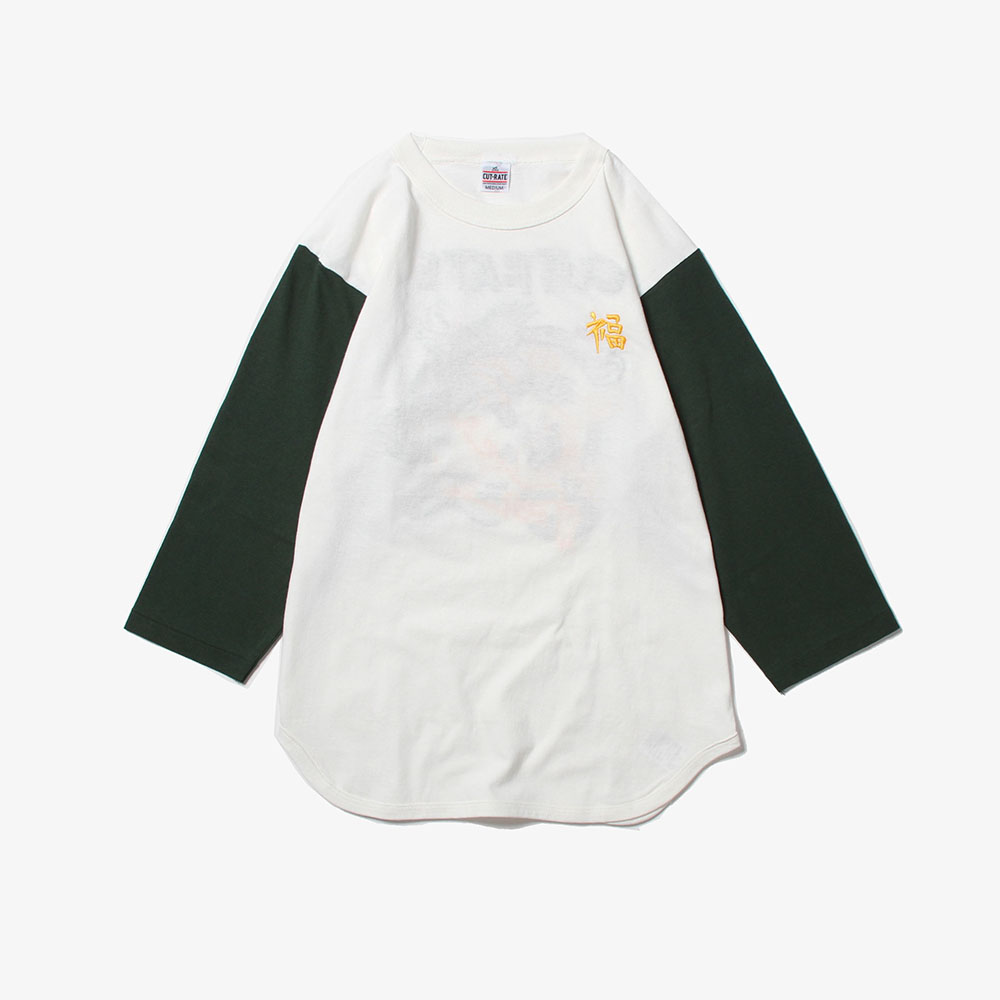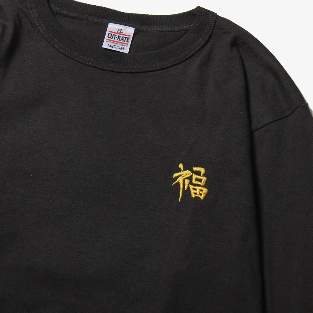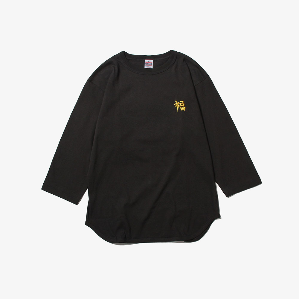 フロント左胸には"福"の刺繍を、背面にはヴィンテージスカジャン等で用いられる、日本マップに鷹と龍を刺繍にて再現。敢えて7部袖のセットインにオン。ボディい自体はコットン100%の6.2OZボディいを採用。是非、秋口に来て頂きたい贅沢なティーシャツが完成。