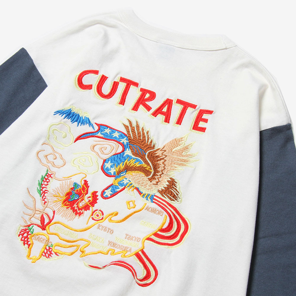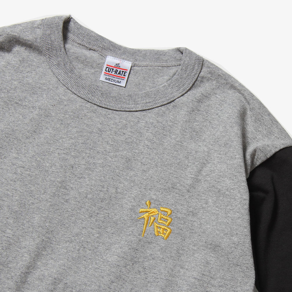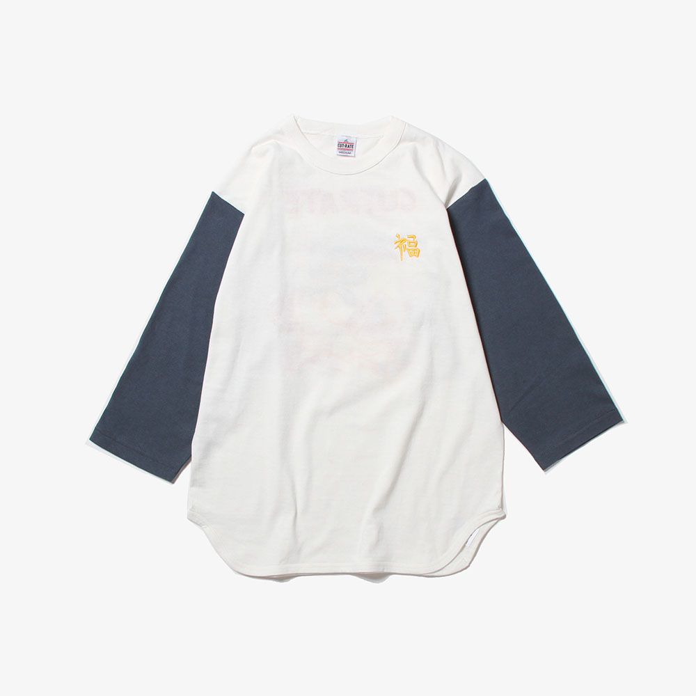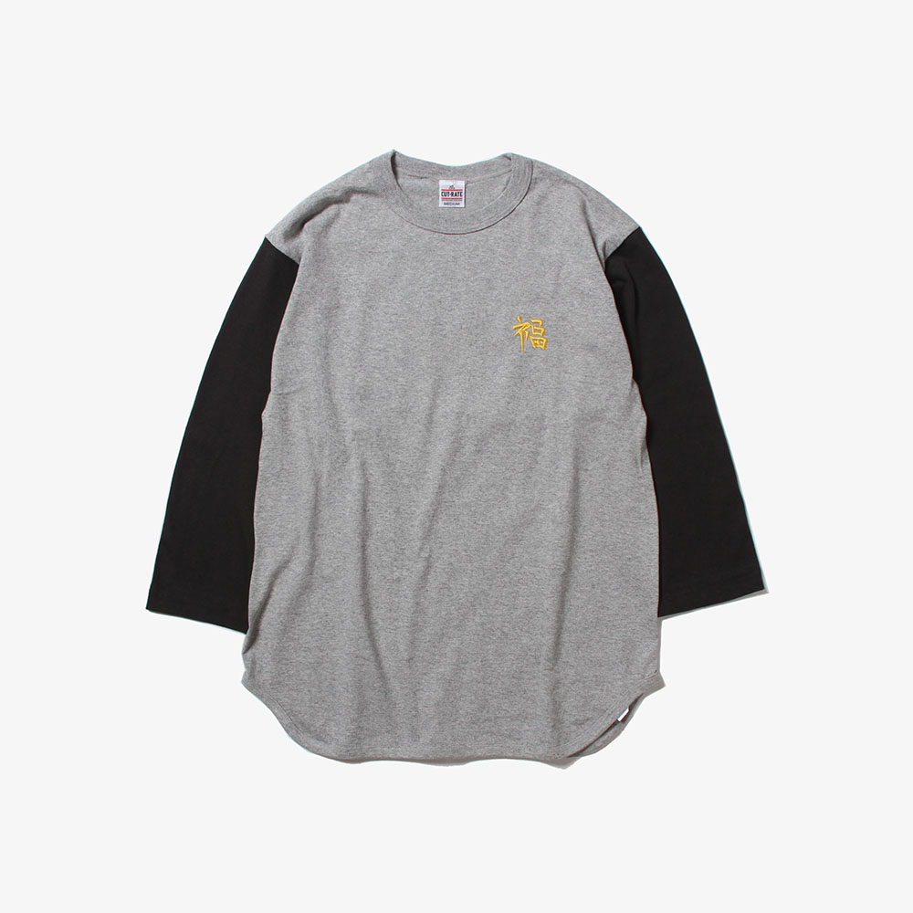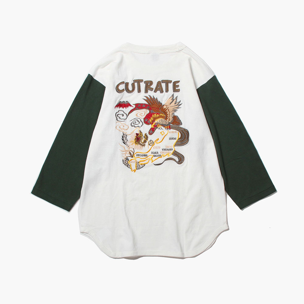 フロント左胸には"福"の刺繍を、背面にはヴィンテージスカジャン等で用いられる、日本マップに鷹と龍を刺繍にて再現。敢えて7部袖のセットインにオン。ボディい自体はコットン100%の6.2OZボディいを採用。是非、秋口に来て頂きたい贅沢なティーシャツが完成。