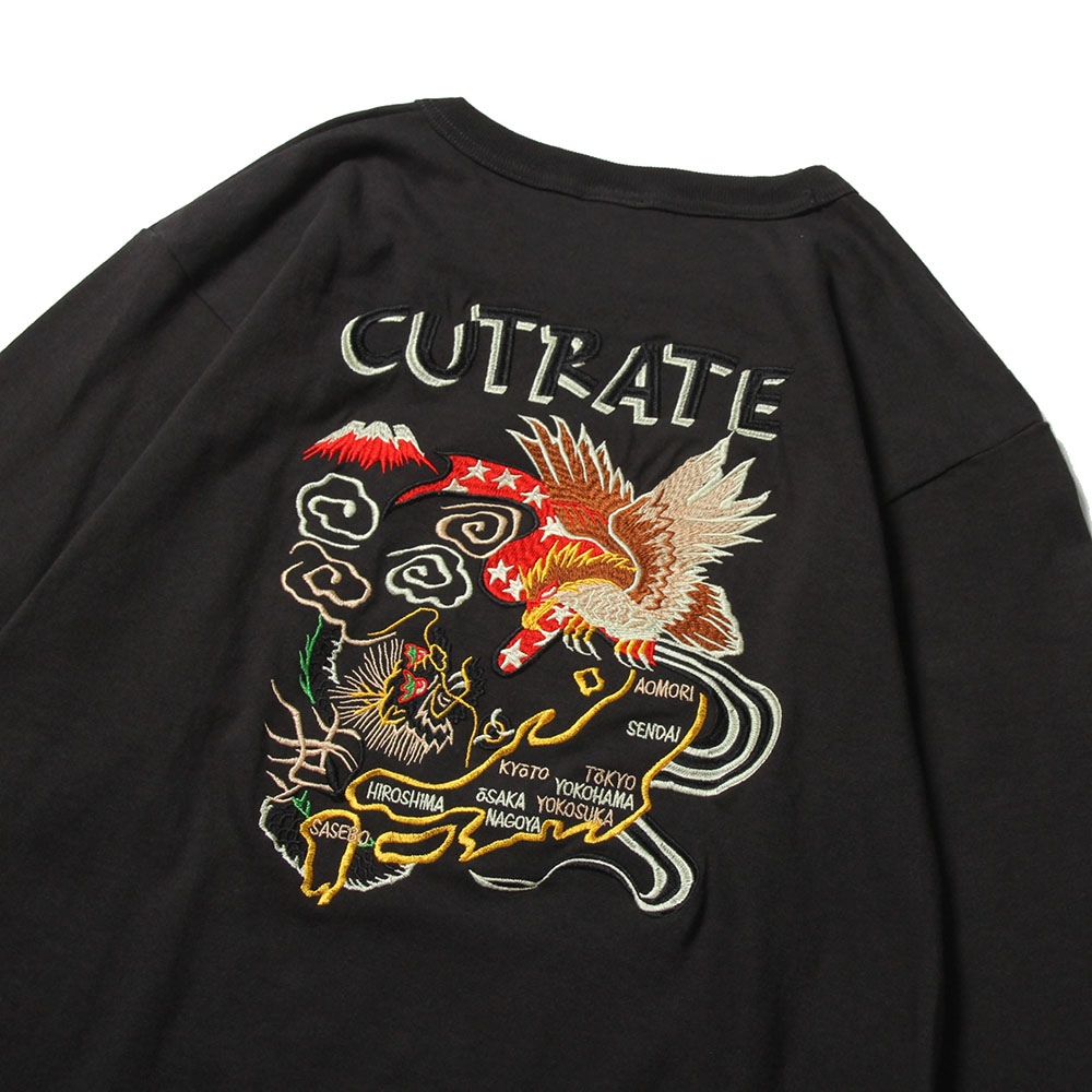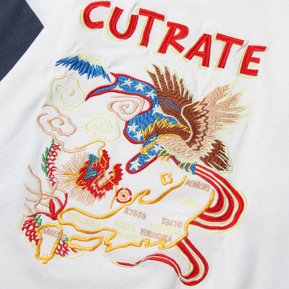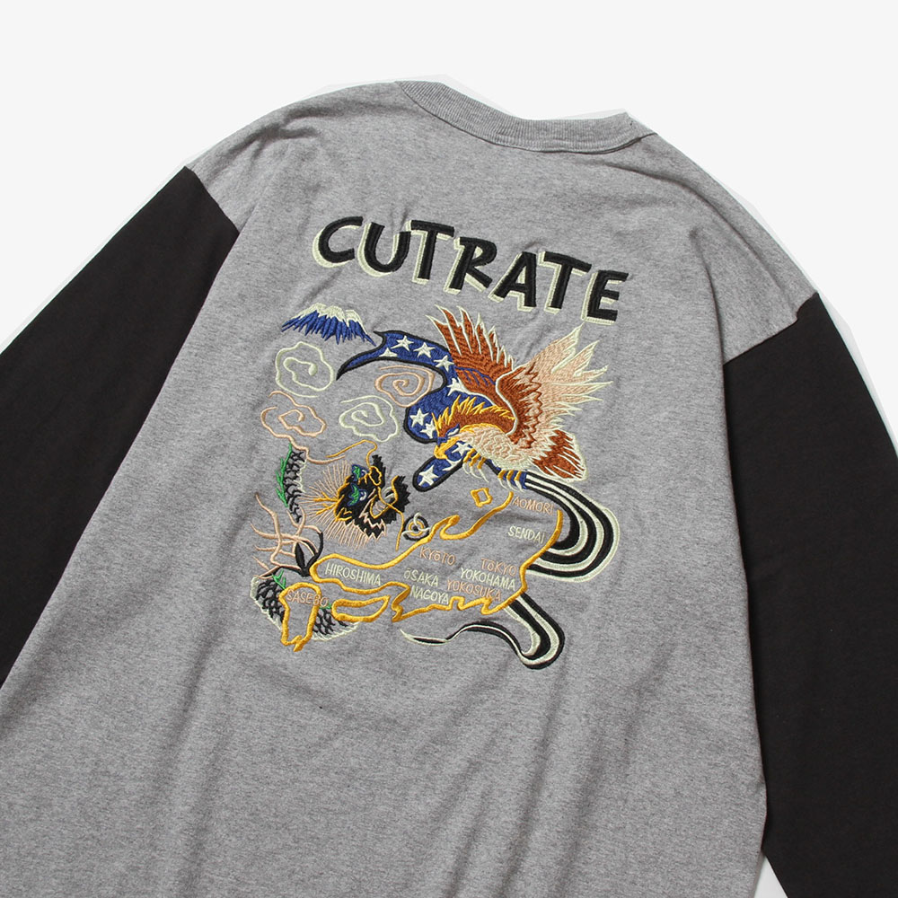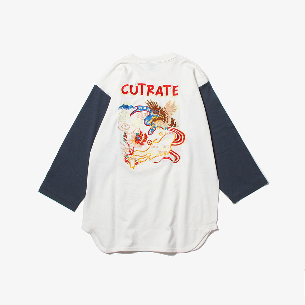 フロント左胸には"福"の刺繍を、背面にはヴィンテージスカジャン等で用いられる、日本マップに鷹と龍を刺繍にて再現。敢えて7部袖のセットインにオン。ボディい自体はコットン100%の6.2OZボディいを採用。是非、秋口に来て頂きたい贅沢なティーシャツが完成。