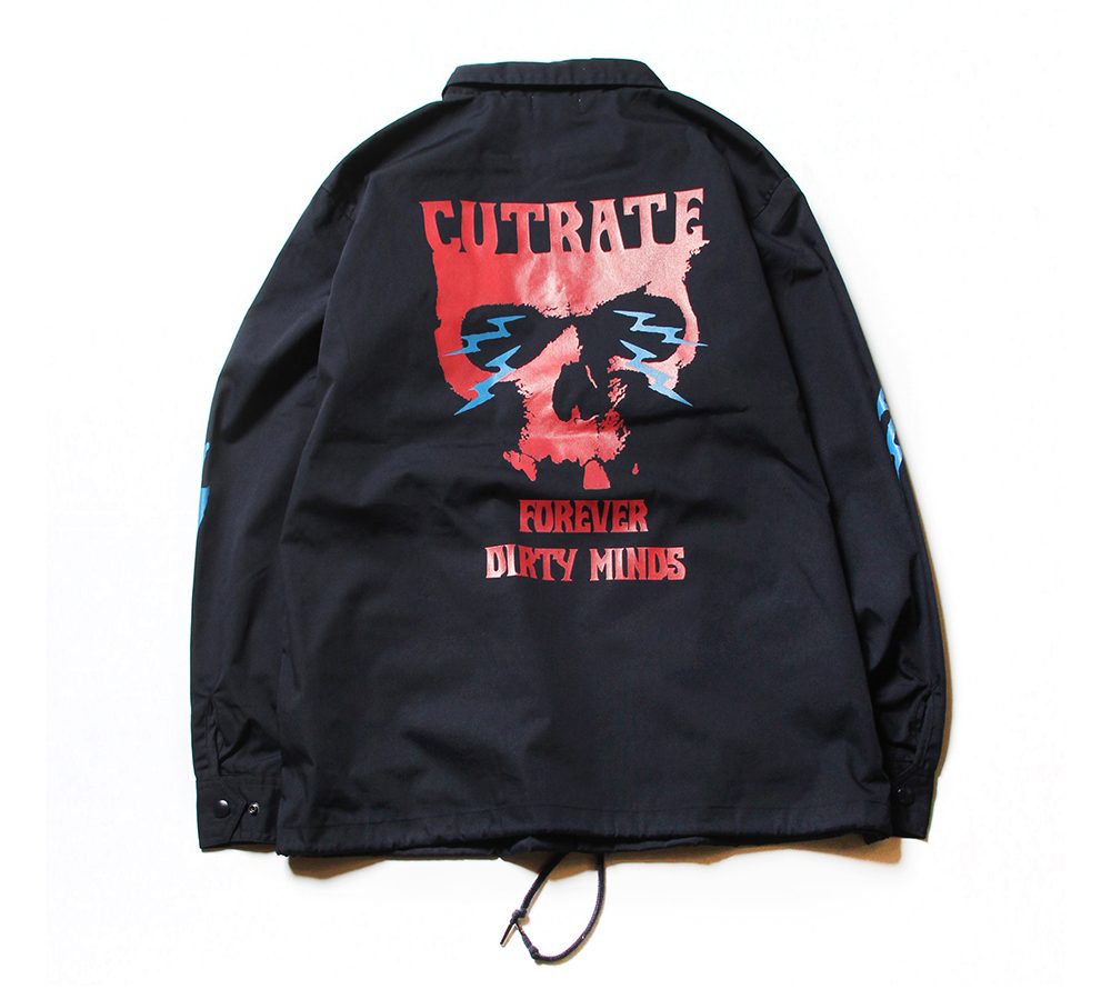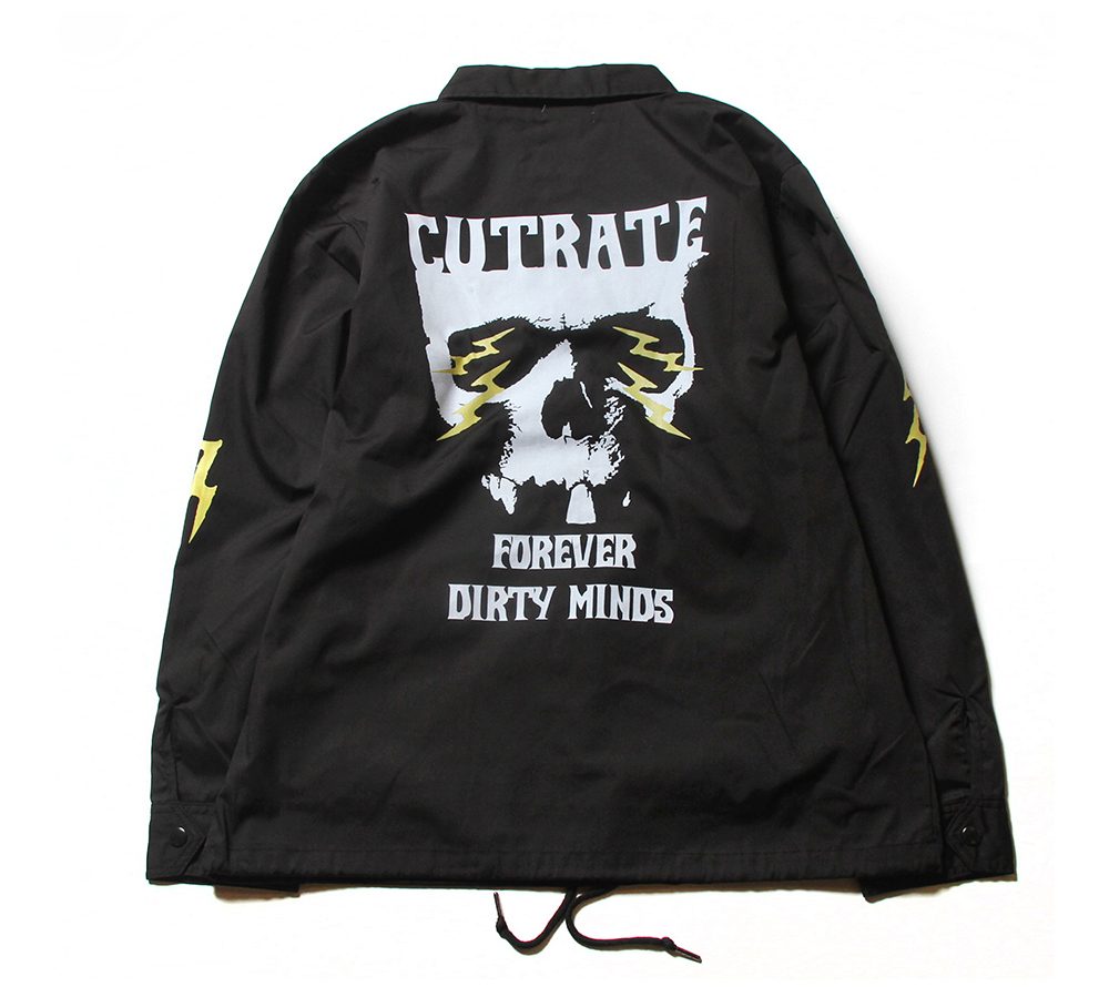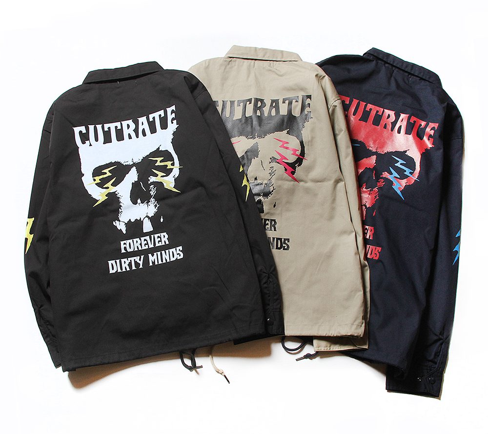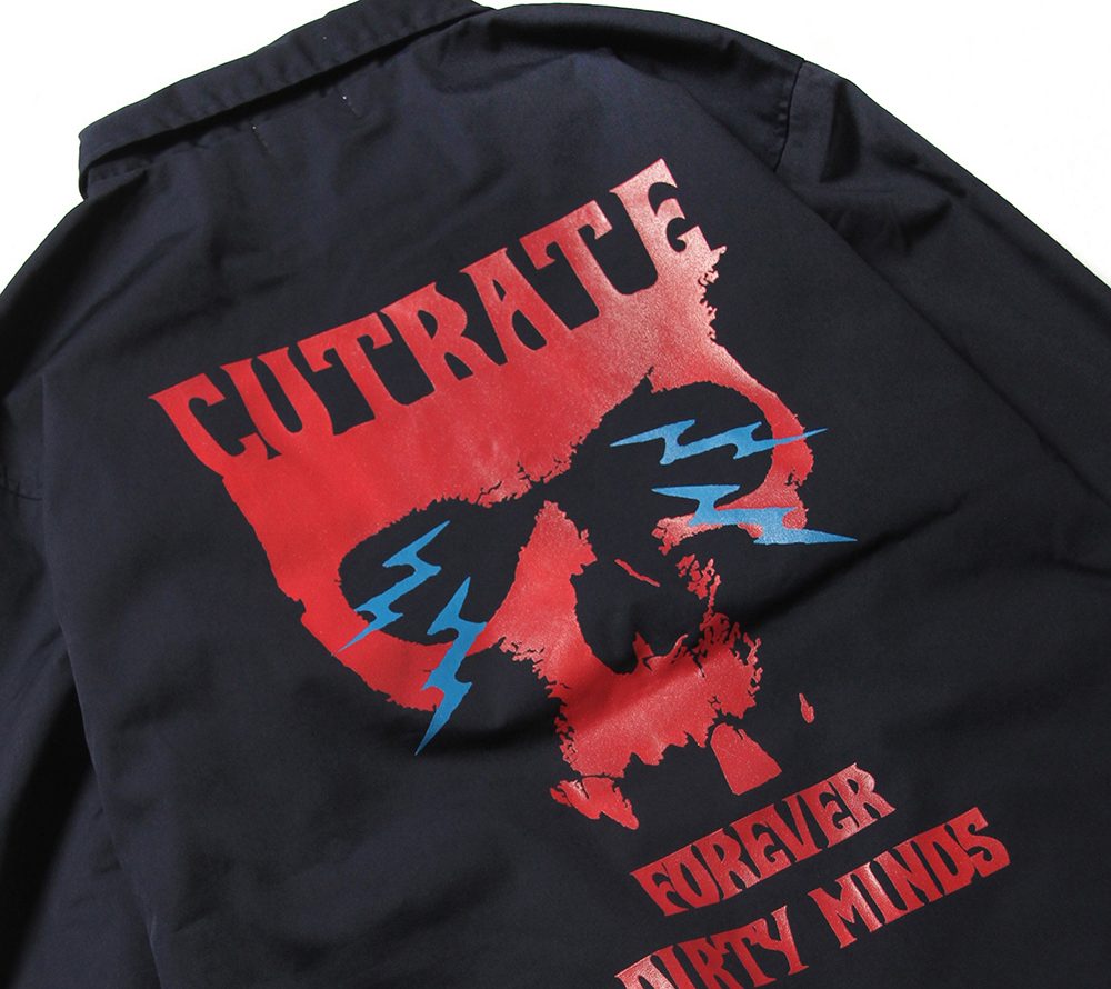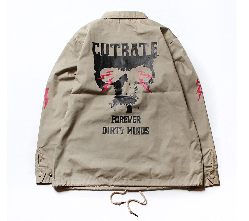 ポリエステル65%、コットン35%のT/Cウェザークロスを使用したコーチジャケット。フロント左胸、バック、両腕にプリントが入ります。CUTRATEらしいインパクトあるグラフィックは勿論、マッドな質感で撥水加工も施したボディーを採用し、機能面でも拘った仕上がりになっています。