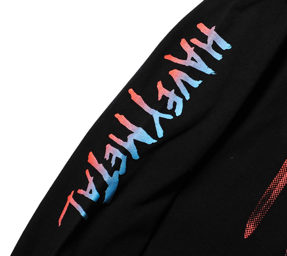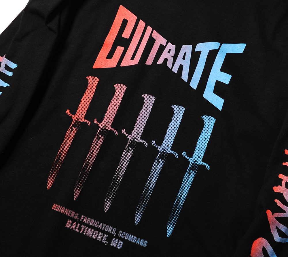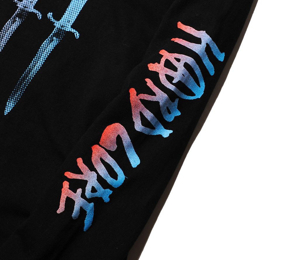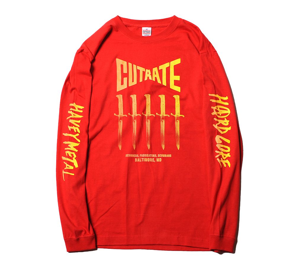 フロント、スリーブにプリントを施したL/S Tシャツ。デザイナーがバックボーンとするミュージックカルチャーやコレクションしているナイフをデザインソースにして、グラフィックに落とし込んだデザインです。コットン100%のボディーを使用しているので、ウォッシュを繰り返し、着込んでいくごとの風合いや経年変化を楽しんで頂きたいアイテムです。