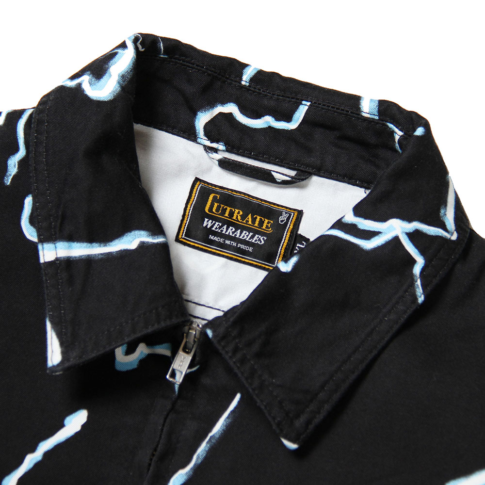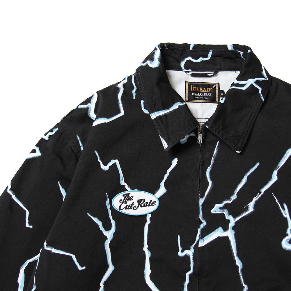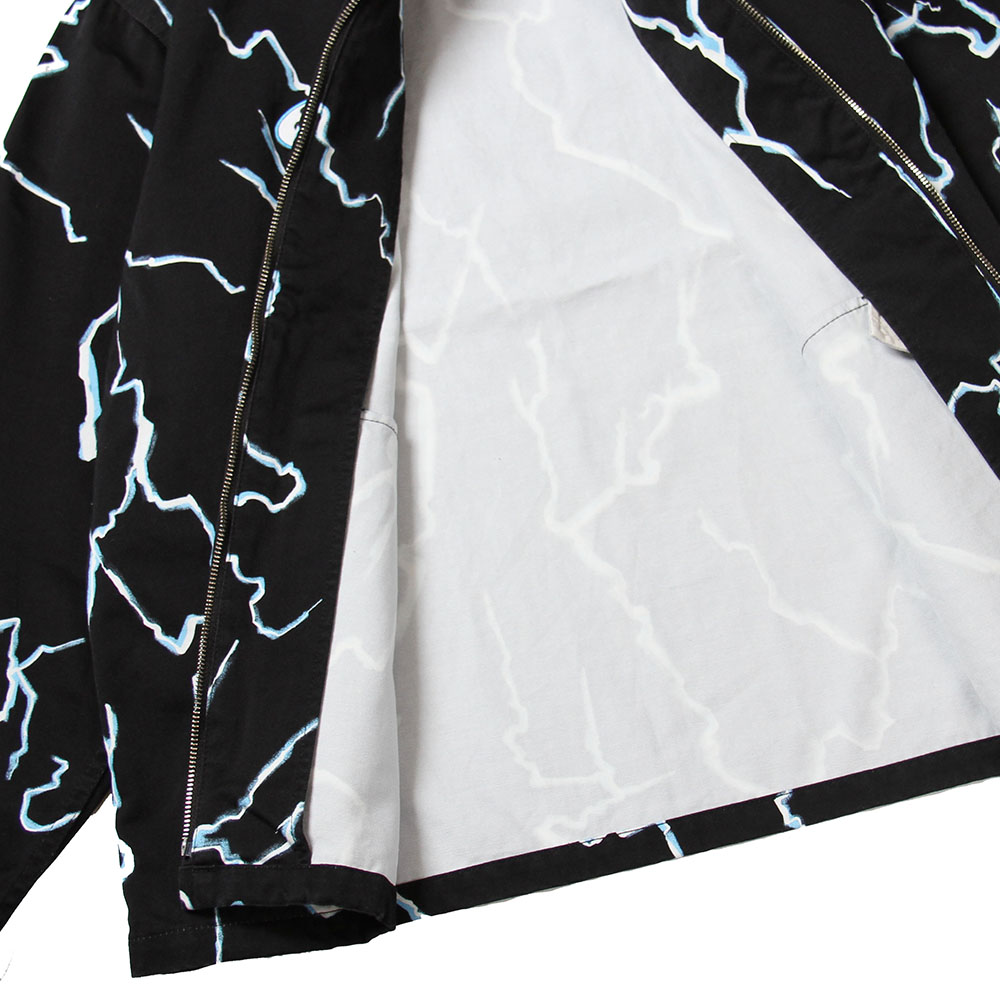 コットンツイル地を使用し、全面に雷をあしらった総柄生地に、襟付き、フロントジップの定番ワークジャケットにてリリース。春先のジャケットの完成。