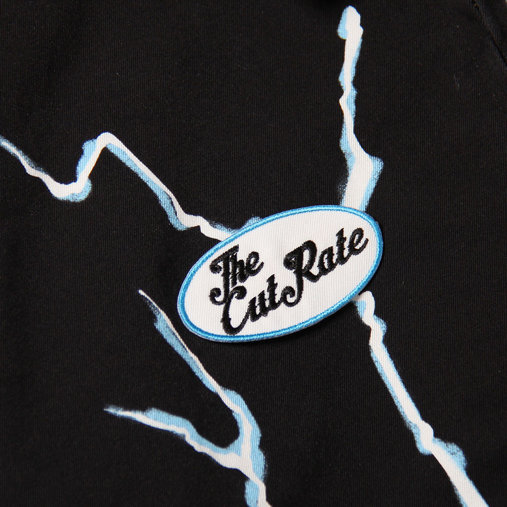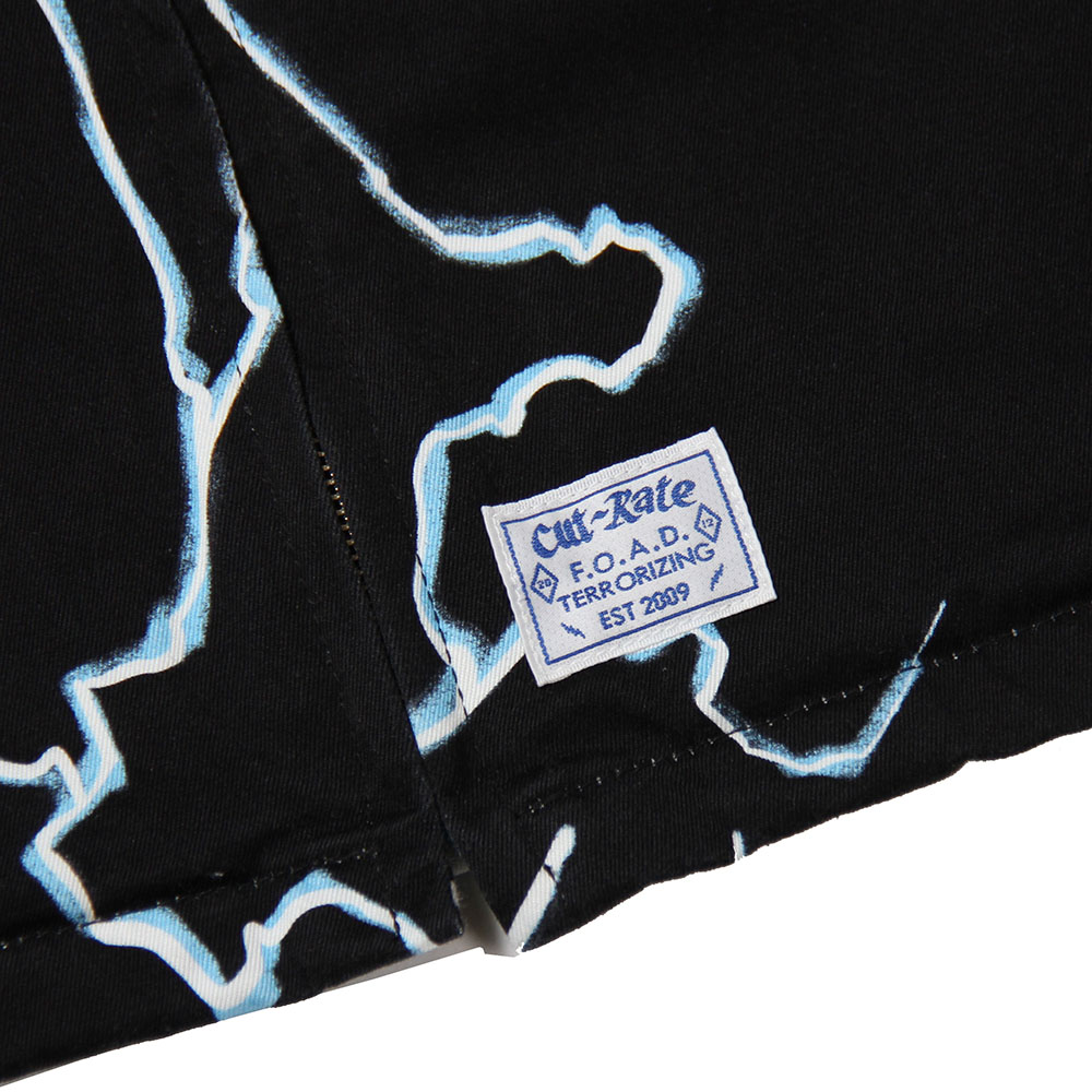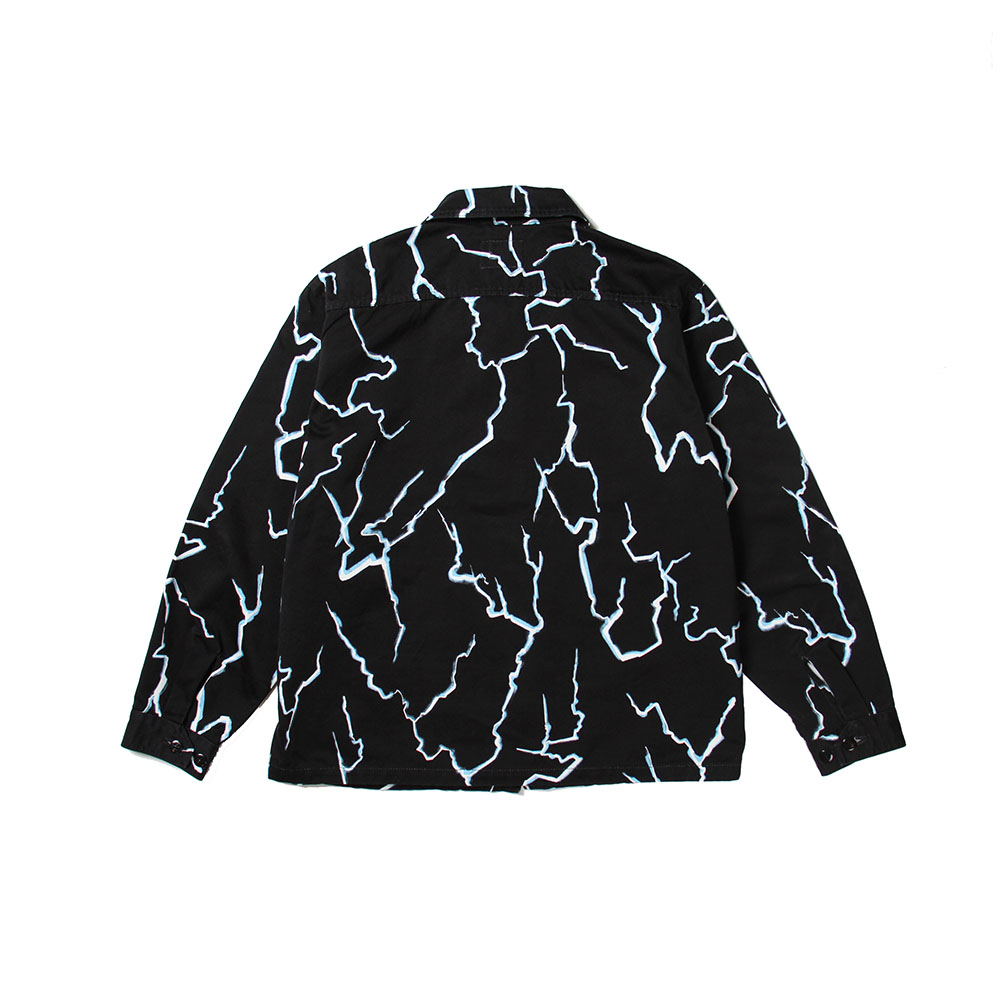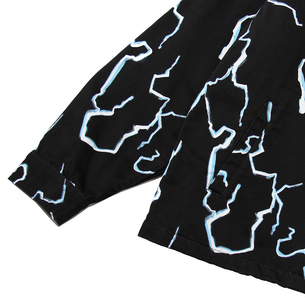 コットンツイル地を使用し、全面に雷をあしらった総柄生地に、襟付き、フロントジップの定番ワークジャケットにてリリース。春先のジャケットの完成。