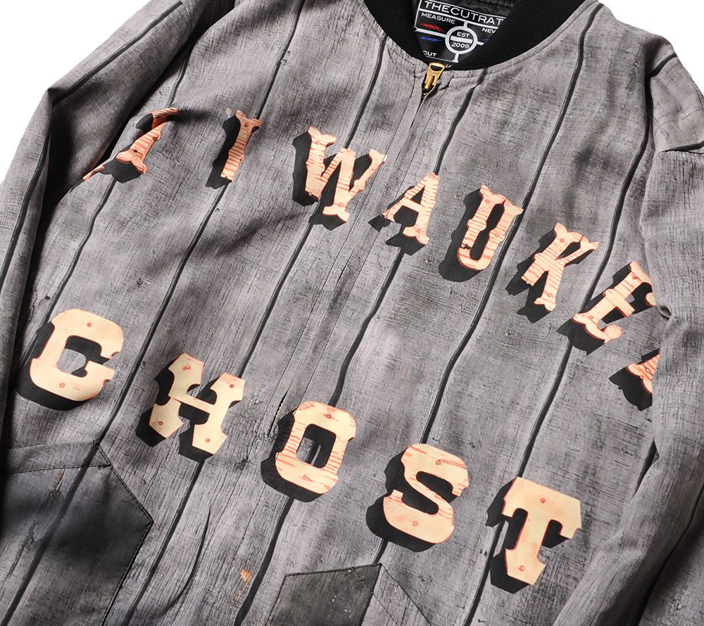 全面に転写プリントを施し製作したジャケット。デザイナーのOLIVER JONESのライフワークの一つでもあるバイクビルド。彼がバイクビルドを行うにあたって、部品の加工や製作工程などのレクチャーを受けた師匠のガレージ兼SHOPが"MILWAUKEE GHOST”。