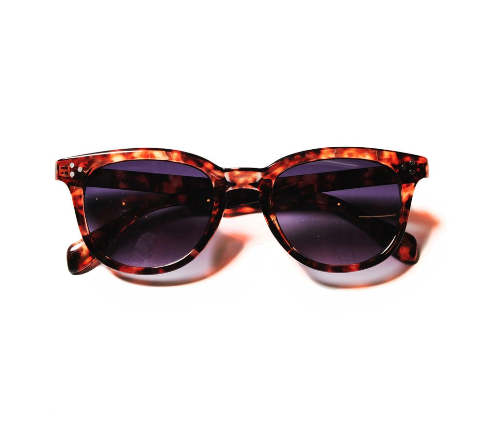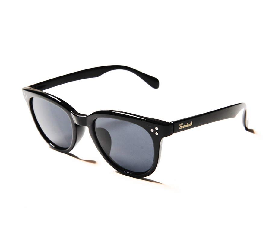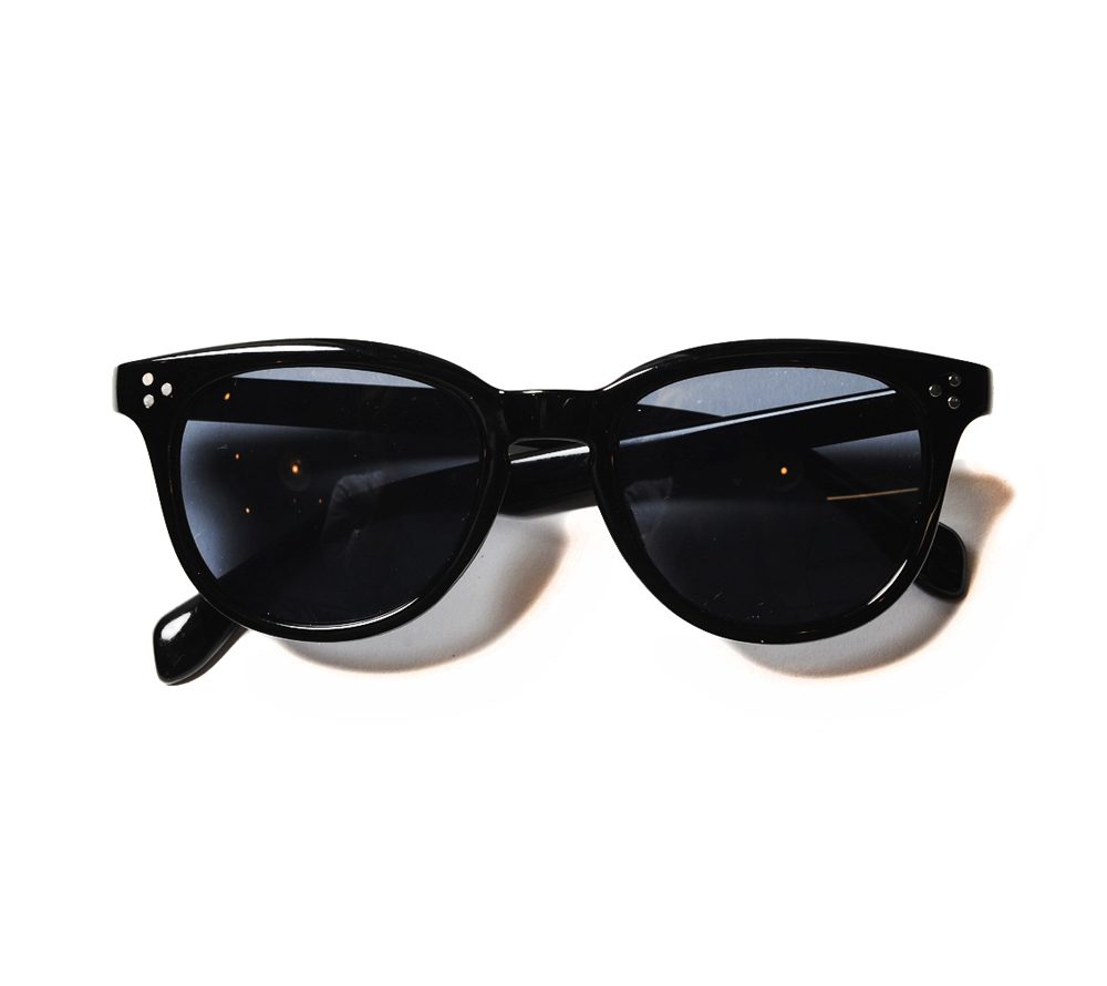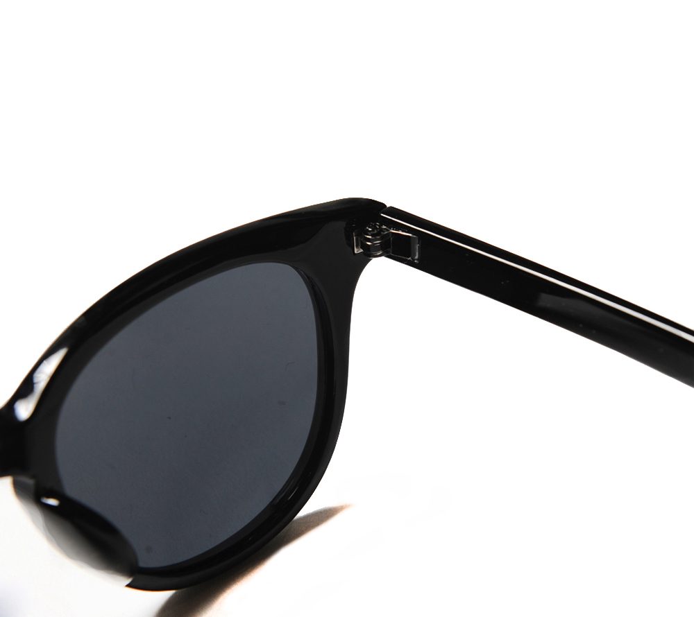 ウェリントンタイプのサングラスです。左テンプルには同色でブランドロゴがデザインされています。ブラックフレームはグレーレンズ、デミフレームはパープルレンズで仕上げています。薄めのレンズで、普段使いでも使いやすい仕様になっています。