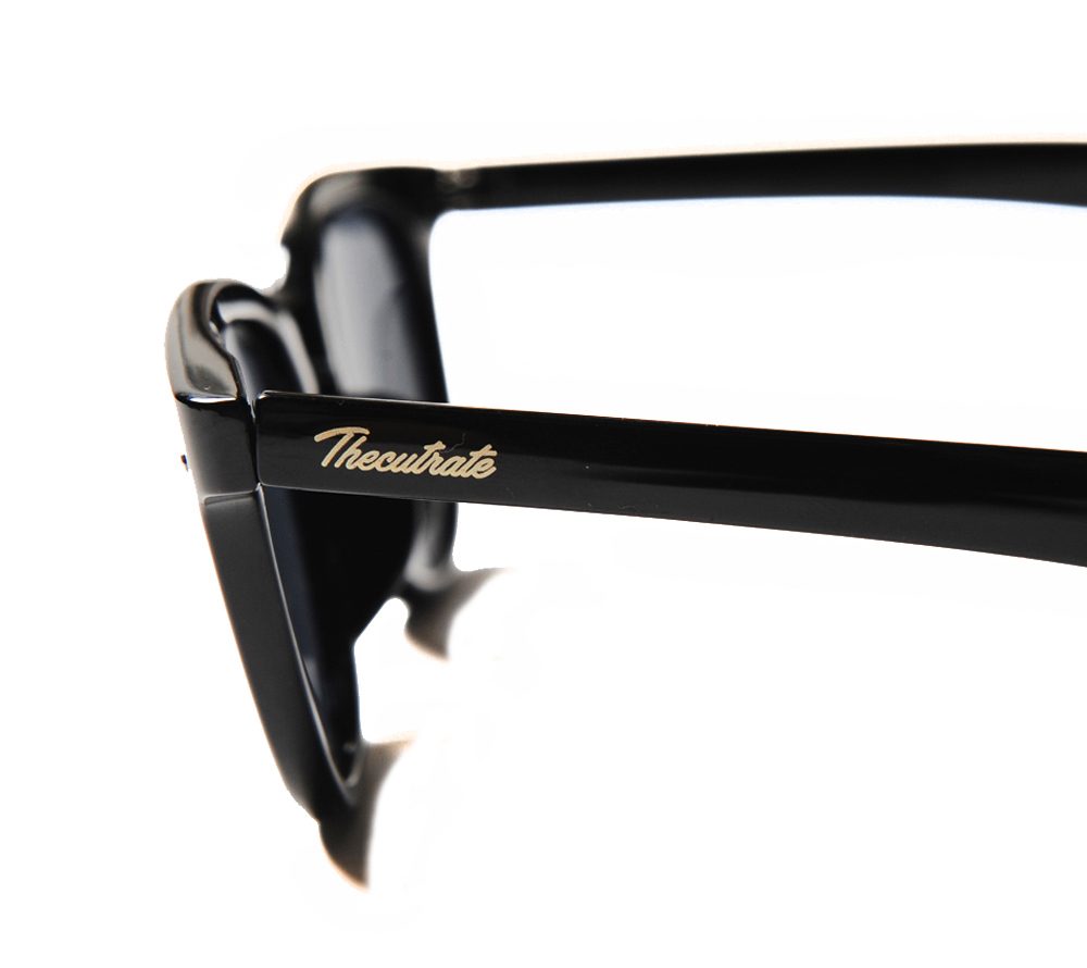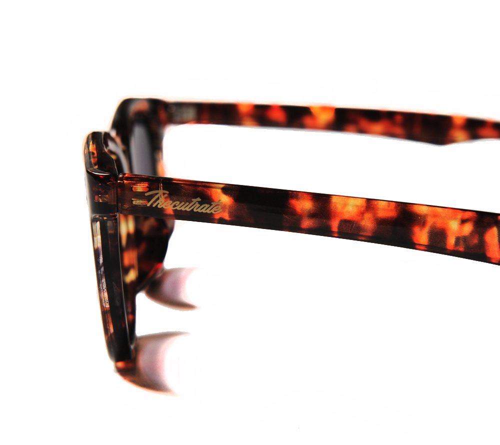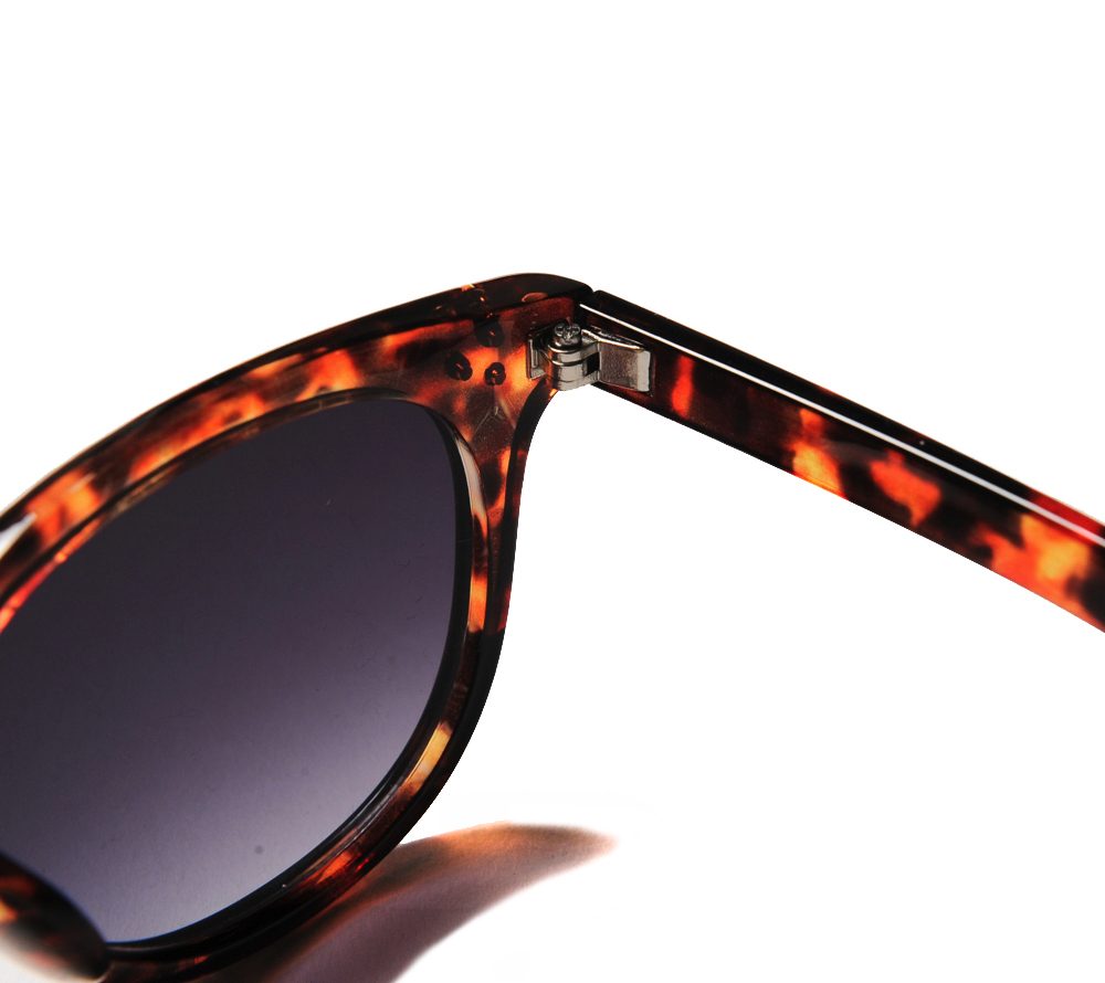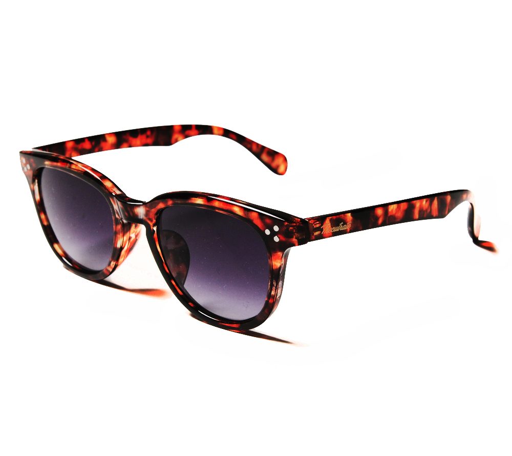 ウェリントンタイプのサングラスです。左テンプルには同色でブランドロゴがデザインされています。ブラックフレームはグレーレンズ、デミフレームはパープルレンズで仕上げています。薄めのレンズで、普段使いでも使いやすい仕様になっています。