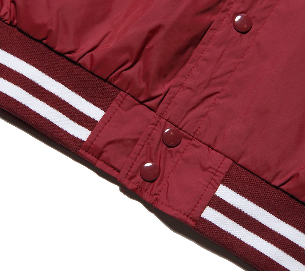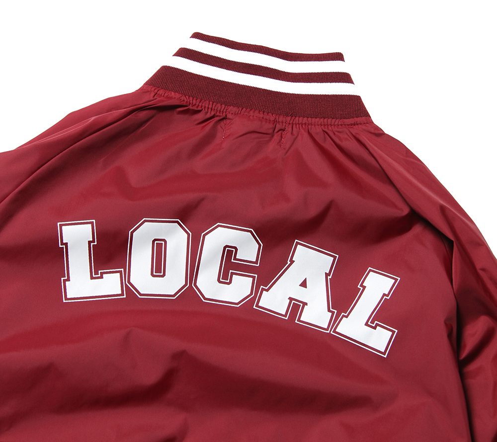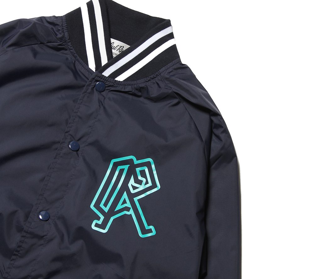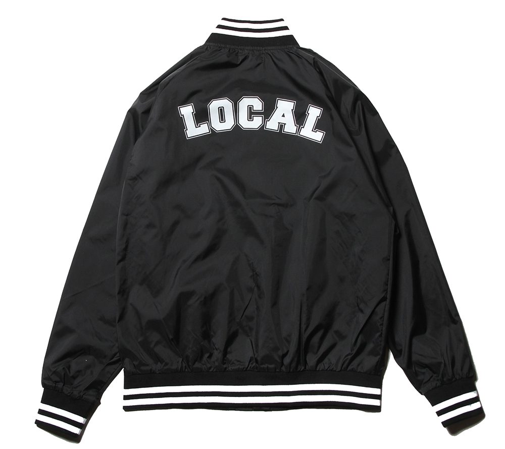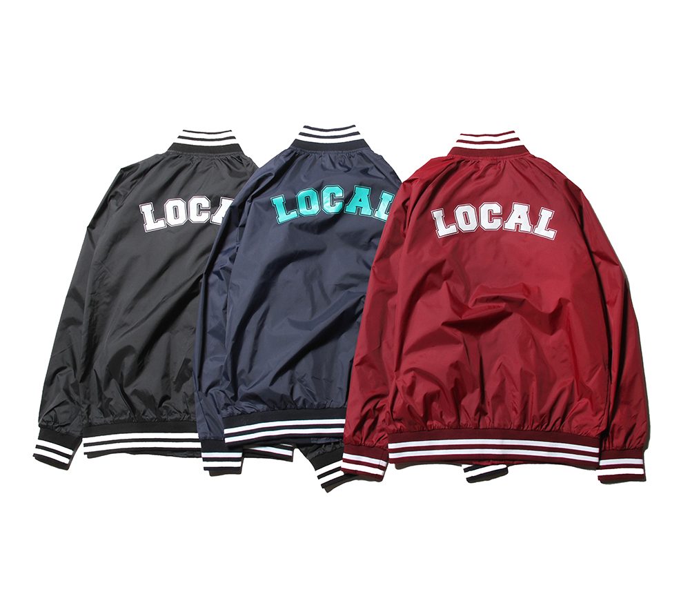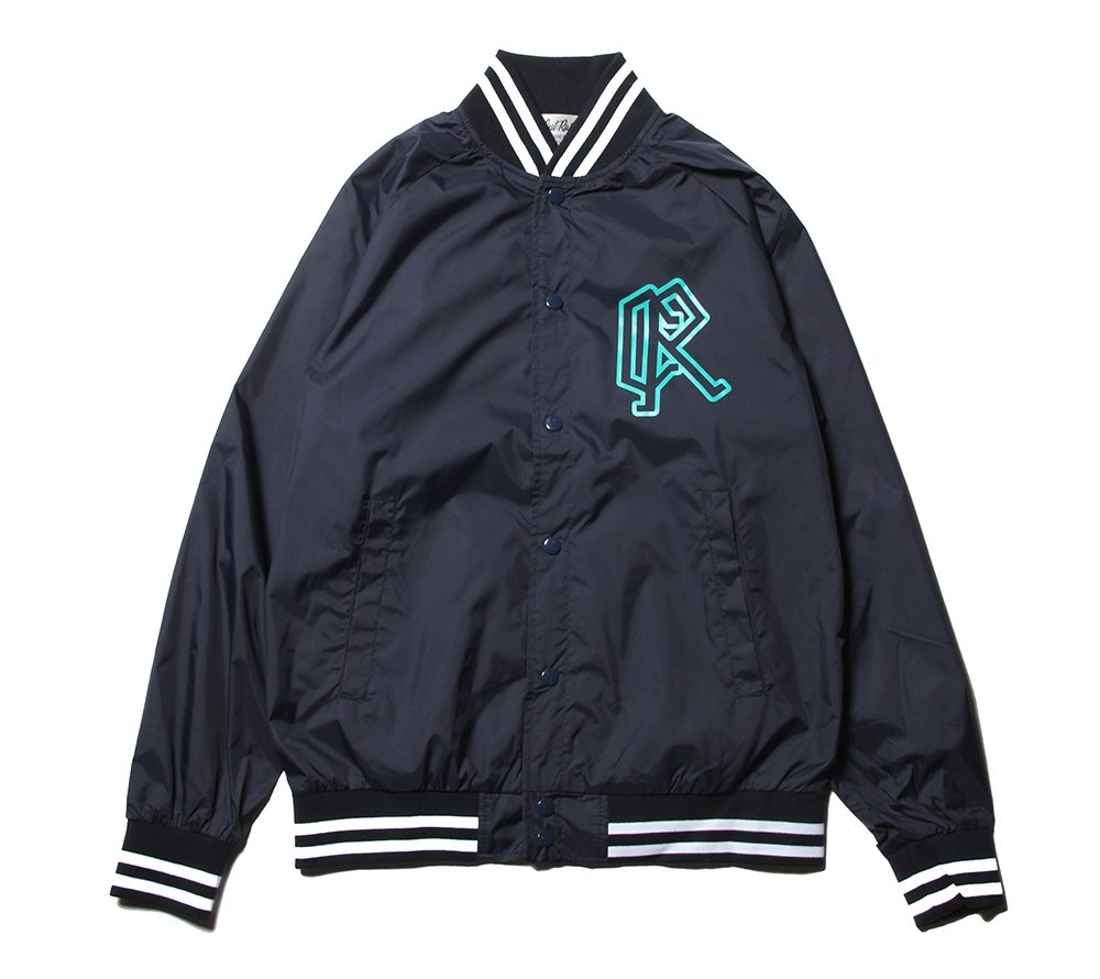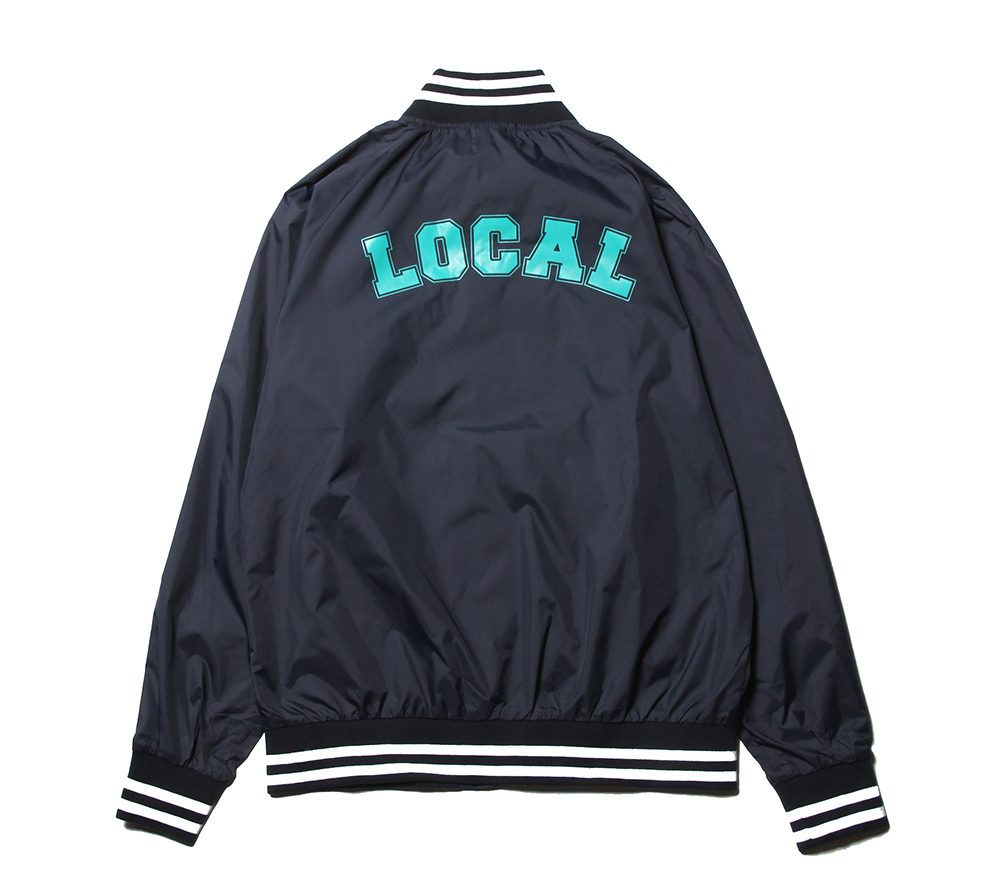 ナイロンタフタ素材を使用した、リブ付きのスタジアムジャケット。フロント左胸、バックにプリントが入ります。裏地がなく、一枚仕立てにする事で、インナー使いで楽しめる春ジャケットです。