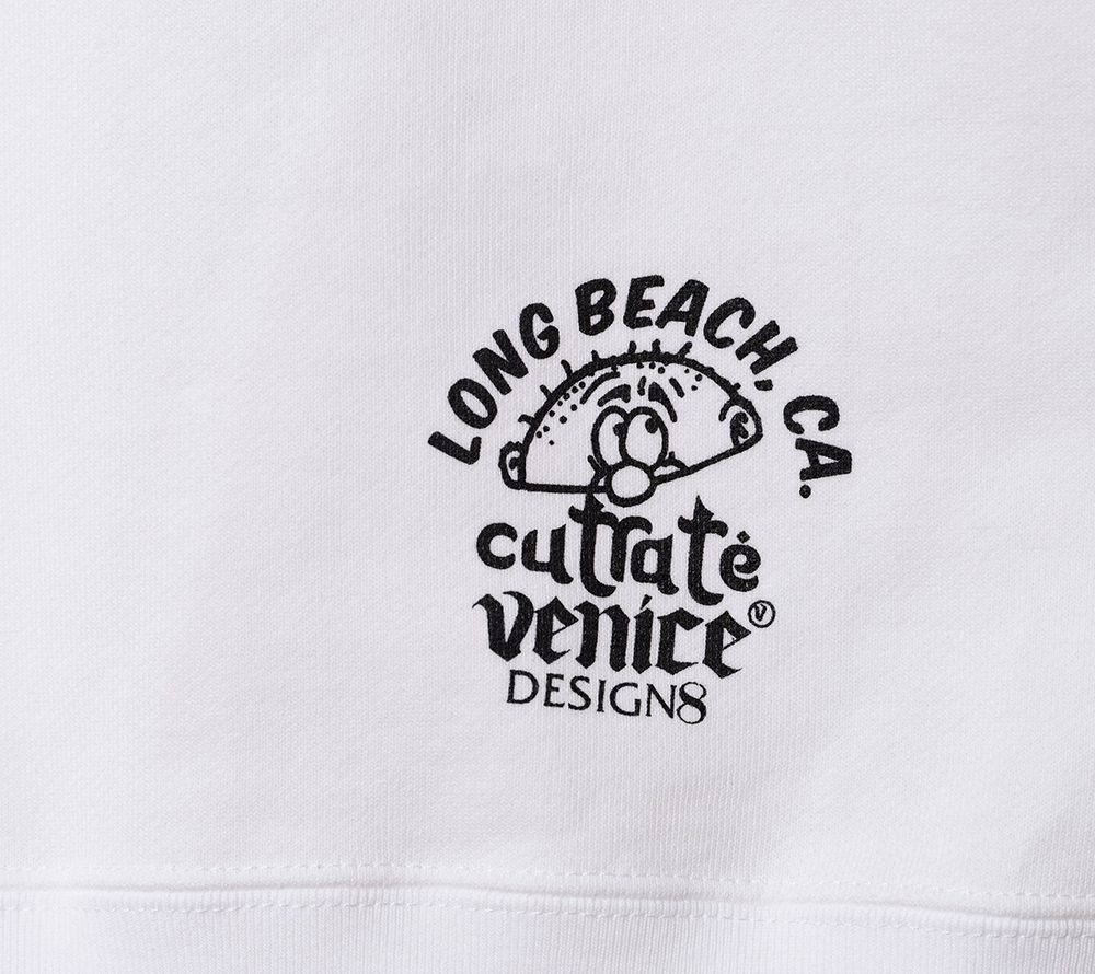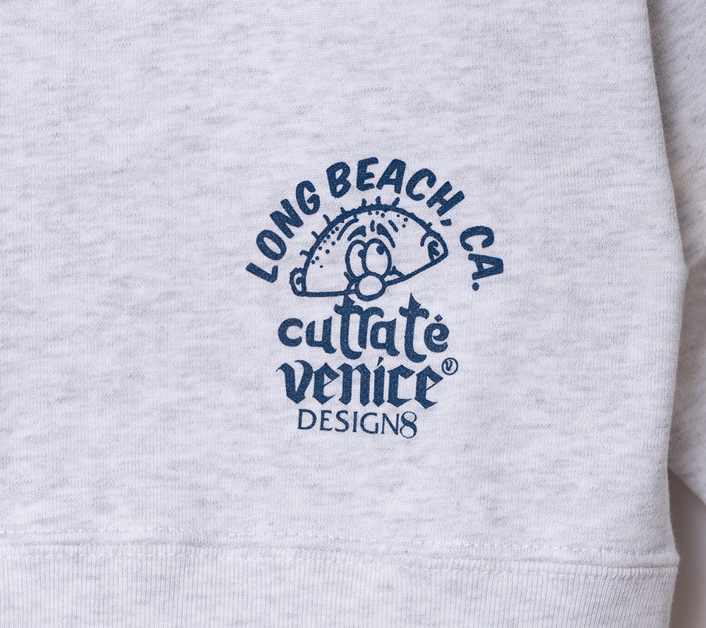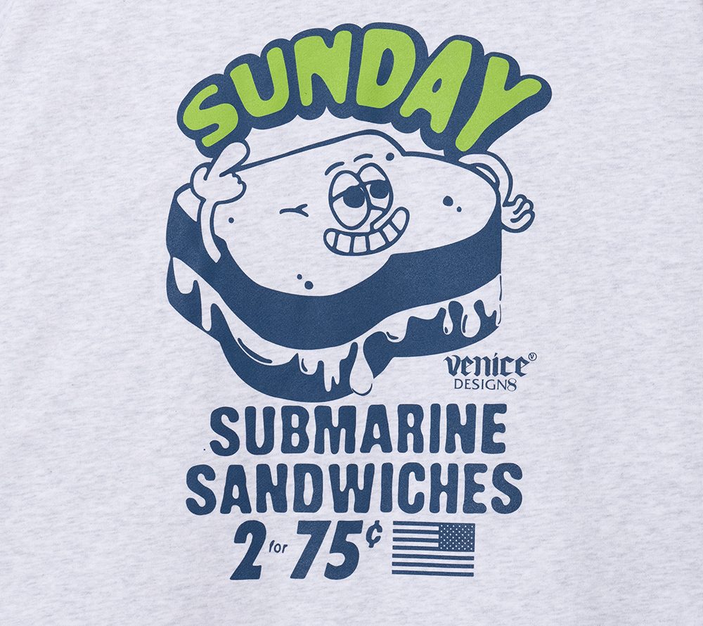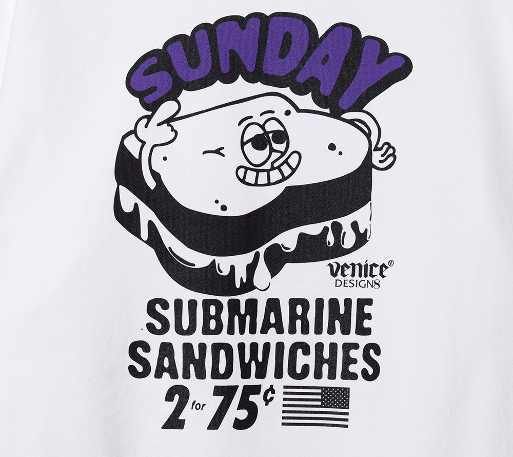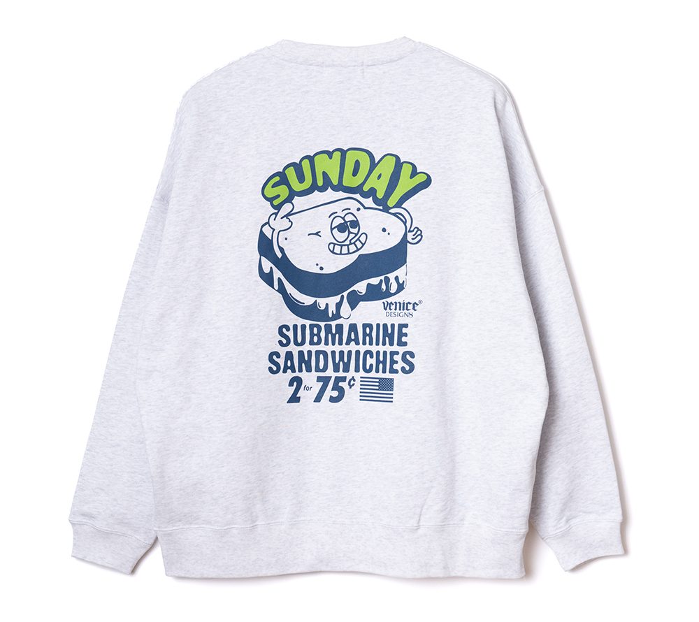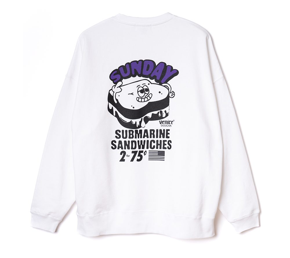 ×VENICE8 COFFEE HOUSE®︎にデザイン製作を依頼したクルーネックスウェット。海兵サンドウィッチをPOPなグラフィックで落とし込んだデザイン。シルエットはドロップショルダーのスウェットで製作。